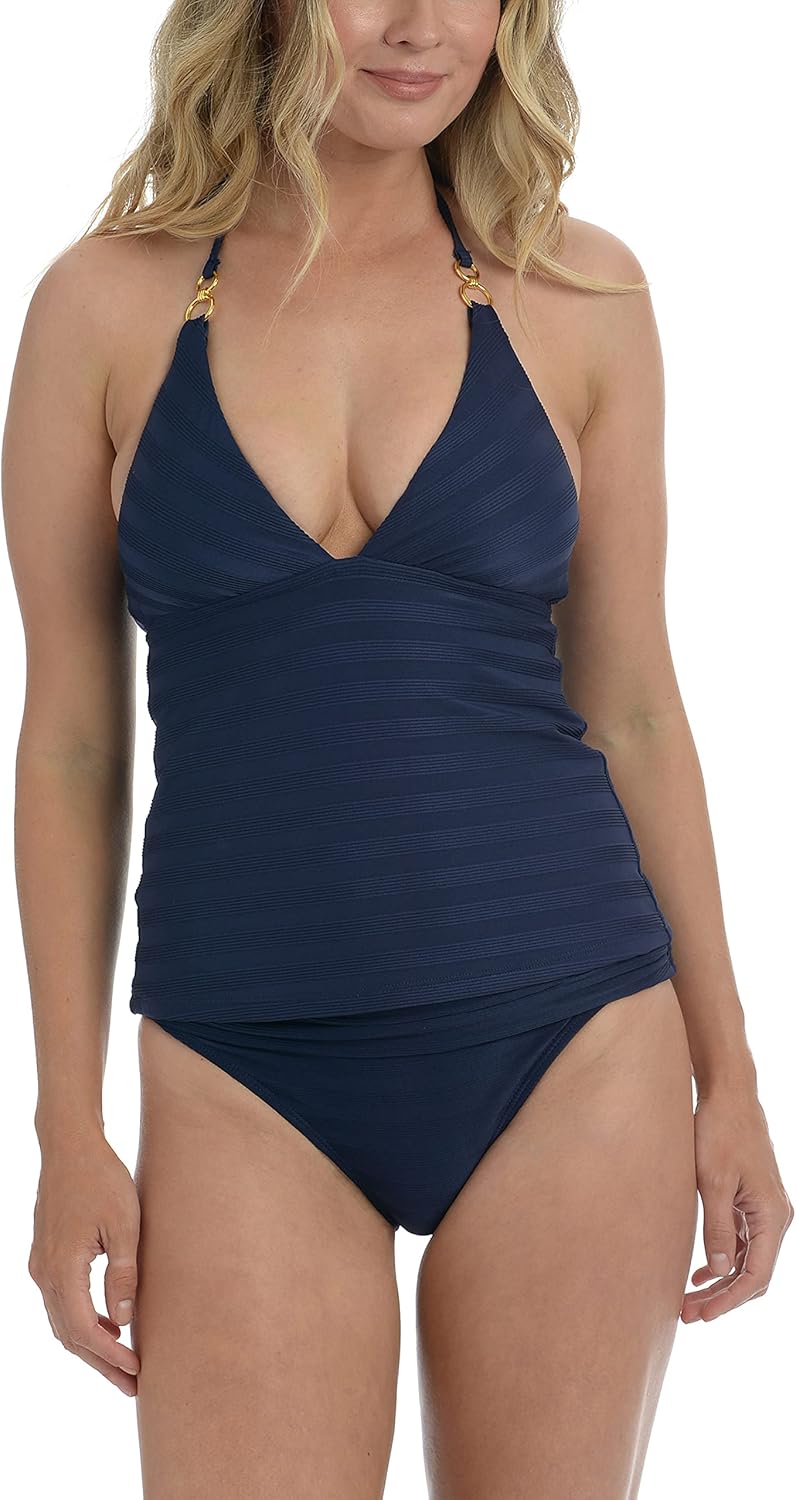 This sleek and sophisticated tankini will instantly put you in a sunshine state of mind. Styled with a deep, plunging neckline, this suit features halter straps that bring balance to your shoulders. Built-in cups and straps that tie around the neck lift and separate for just-right support. Offering the mix-and-match versatility of a bikini with the coverage of a one-piece suit, it's destined to be your go-to this season. .
