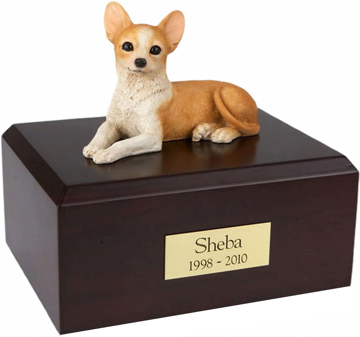 A Loyal, and fearless best friend, the Chihuahua. Honor your dearly departed canine friend with this full-color White and Tan Chihuahua Figurine Pet Cremation Urn. This elegant pet urn is made from a solid hardwood, and adorned with an attached full-color resin White and Tan Chihuahua figurine. Personalize your pet memorial with a premium leaded brass nameplate (2 lines of text, 25 characters per line including spaces). Your pet's bagged ashes are inserted through a removable easy-access bottom panel which is secured with screws, providing tamper resistant protection. Each figurine is carefully crafted from a cold cast resin by talented artists, and hand-painted, which accounts for a beautifully detailed and life-like sculpture on this stunning dog urn. Urn Measurements and Capacity: 7.75" L x 6"W x 2.75"H with a cpacity of 55 cubic inches for a dog weighing up to 45 pounds. Your White and Tan Chihuahuas urn can be made from one of three beautiful hardwoods. Select from a light maple, medium oak, or dark walnut finish in the customization menu.