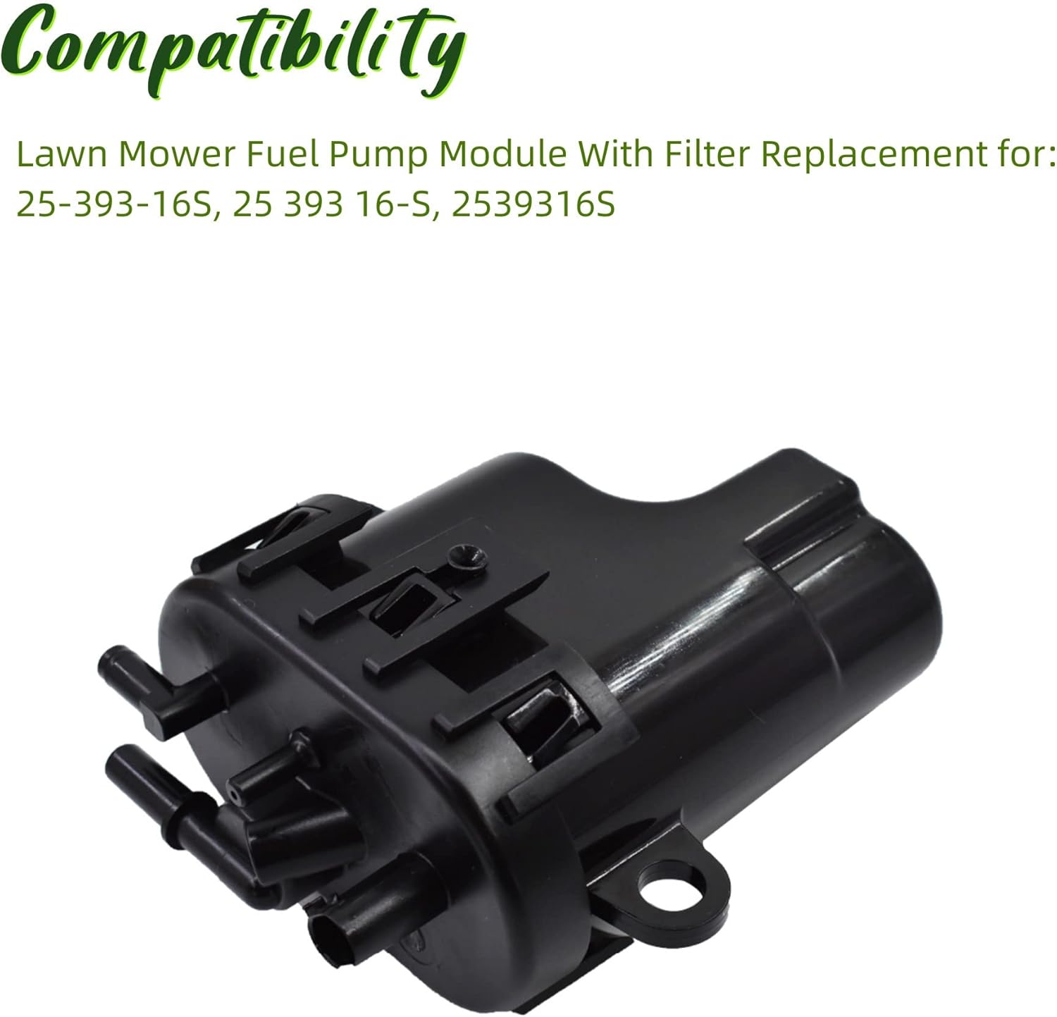 FITMENTLawn Mower Fuel Pump Module With Filter Replace Part Numbers 25-393-16S, 25 393 16-S, 2539316SLawn Mower Fuel Pump Module With Filter Replacement for Kohler ECH ECV ModelLawn Mower Fuel Pump Module With Filter Replacement for ECH630 ECH650 ECH680 ModelLawn Mower Fuel Pump Module With Filter Replacement for 25 393 11-S, 25 393 10-S, 25 393 09-S ModelPAKING LIST1x Lawn Mower Fuel Pump1x Fuel FilterQUALITYEasy to Install Good Working Condition Very Durable