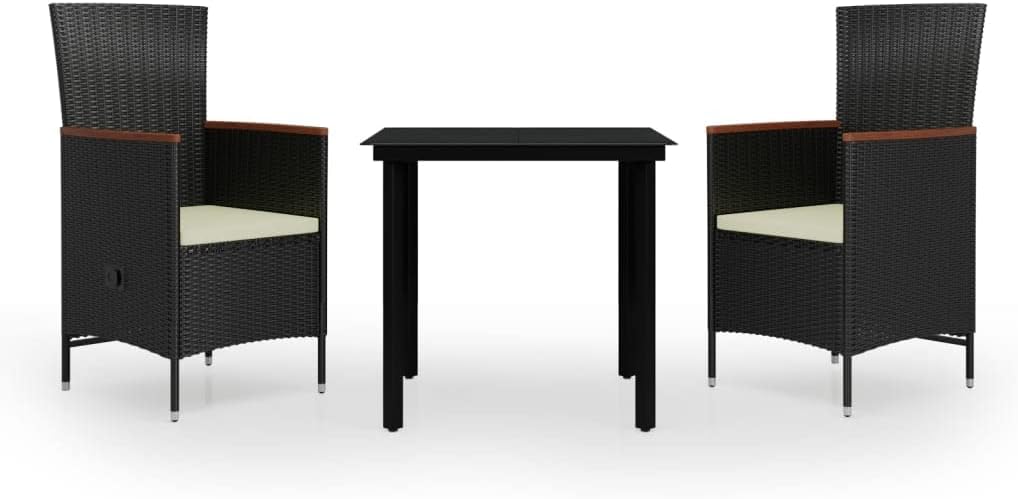 This stylish garden dining set is meant to be the focal point of your garden or patio! It is a great choice for al fresco dining or relaxing in the outdoor space!The powder-coated steel frames make the table and chairs sturdy and stable for daily outdoor use. Thanks to the water-resistant PE rattan, the chairs are easy to clean and hard-wearing. The backrest reclines by pulling the button on the side. Thanks to the lightweight construction, they are easy to move. The thickly-padded seat cushions also add extra comfort. The low-maintenance polyester covers can be removed and washed. Additionally, the smooth glass tabletop is easy to clean with a damp cloth and perfect for placing meals, drinks and other decorative items.Note: In order to extend the life of your outdoor furniture, we recommend you to clean it regularly and do not leave it outdoors without protection unnecessarily.Clean: Use a mild soap solution.Storing: If possible, store in a cool, dry place indoors. If the product is stored outdoors, protect it with a waterproof cover. Wipe and dry the excess water or snow from flat surfaces after a rain or snowfall. Allow sufficient air circulation to avoid moisture-related damage.Color: BlackCushion color: Cream whiteMaterial: PE rattan, solid acacia wood, powder-coated steel, glassCushion cover material: 100 % polyesterTable dimensions: 31.5" x 31.5" x 29.1" (L x W x H)Chair dimensions (not reclined): 22.8" x 24.4" x 42.5" (W x D x H)Chair dimensions (reclined): 22.8" x 35.4" x 35.8" (W x D x H)Cushion thickness: 2"Seat width: 18.5"Seat depth: 18.5"Seat height from the ground without cushion: 16.9"Armrest height from the ground: 26.4"Assembly required: YesDelivery contains:1 x Table2 x Chair2 x Seat cushion