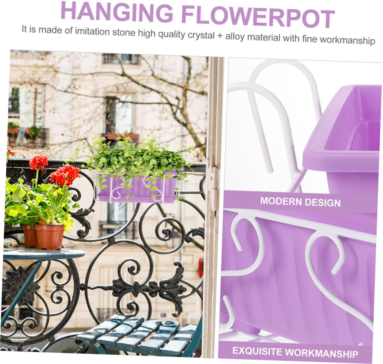 Package Include 1 x Windowsill Box 1 x Drip Tray 1 x Planter Rack Features -Material:Plastic and iron - Color: Purple - Size: 46.00X21.00X18.00cm/18.08X8.25X7.07in -Product Info:Rectangular hanging flower pot - This planting pot is suitable for growing vegetables, succulents, cacti, herbs, flowers, etc plastic flower pots. - Suitable for greening engineering, home gardening, balcony vegetable garden, flower garden nursery production plastic window planter. - Good for growing plants and flowers, bringing good gardening and to add elegance and color to your life. - You can use the plant pot for a lasting time as it's resistant to scratch, abrasion and impact, not easy to break, crack or break caused by sunlight plastic flower pot. - The planting pot is a great choices for friends, family, and garden lovers, they will like this planter pots.Goods Descriptionplastic flowerpot This professional planter pot, made of iron and plastic material, is practical and portable for use.balcony planting pot Suitable for growing plants, fruits, vegetable and whatever you like.window flowerpot Designed with bottom breathable design that will provide proper airflow and water drainage, your plant growth