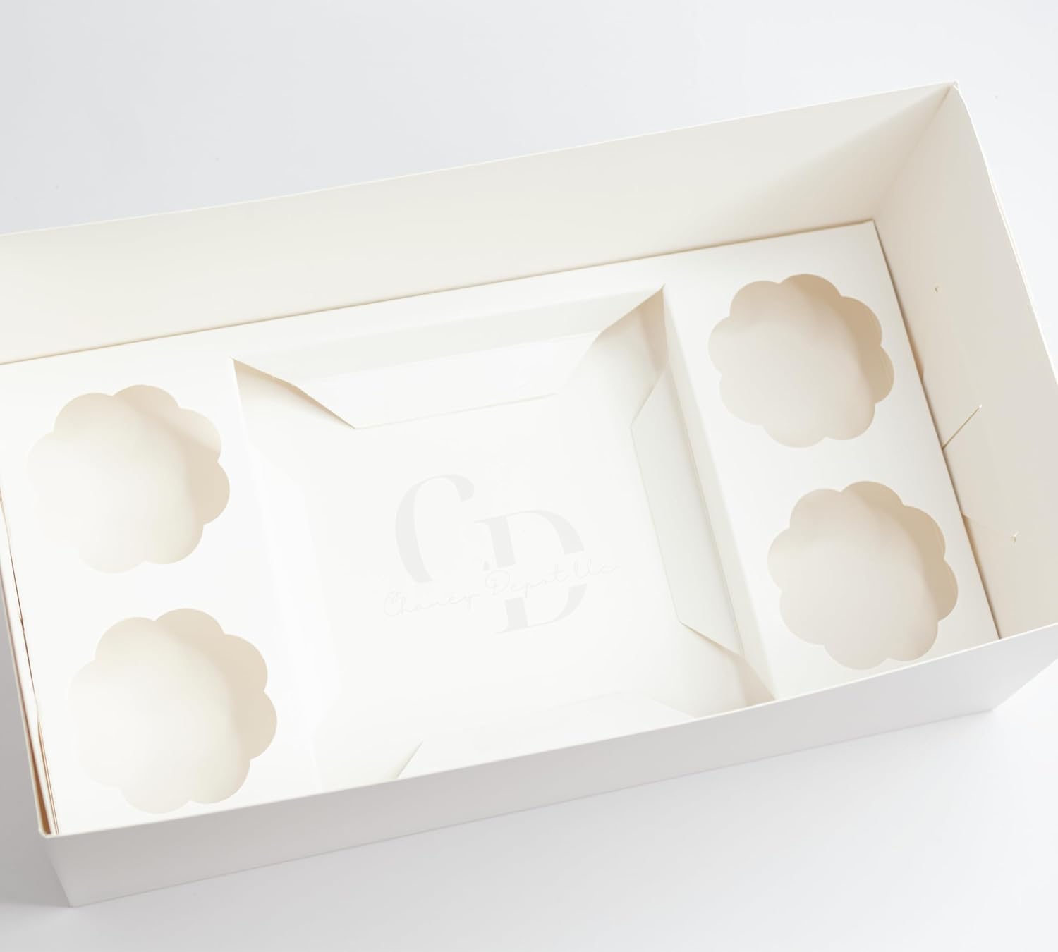 Present your delectable creations with elegance in this versatile white bakery box featuring a clear display lid. Thoughtfully designed with a spacious center cavity that accommodates a 4-5 inch cake, plus four perfectly sized cupcake holders arranged around the perimeter. The sturdy construction ensures your baked goods stay secure during transport, while the clear top allows your artistic decorations to shine through. Assembly is a breeze with the box's user-friendly design - simply fold along the pre-marked lines and you're ready to showcase your confectionery masterpieces. The clean white interior provides an elegant backdrop that makes your colorful treats pop. Whether you're a home baker or professional pastry chef, this box offers the perfect solution for presenting and delivering your special occasion cakes and cupcakes with style and security.