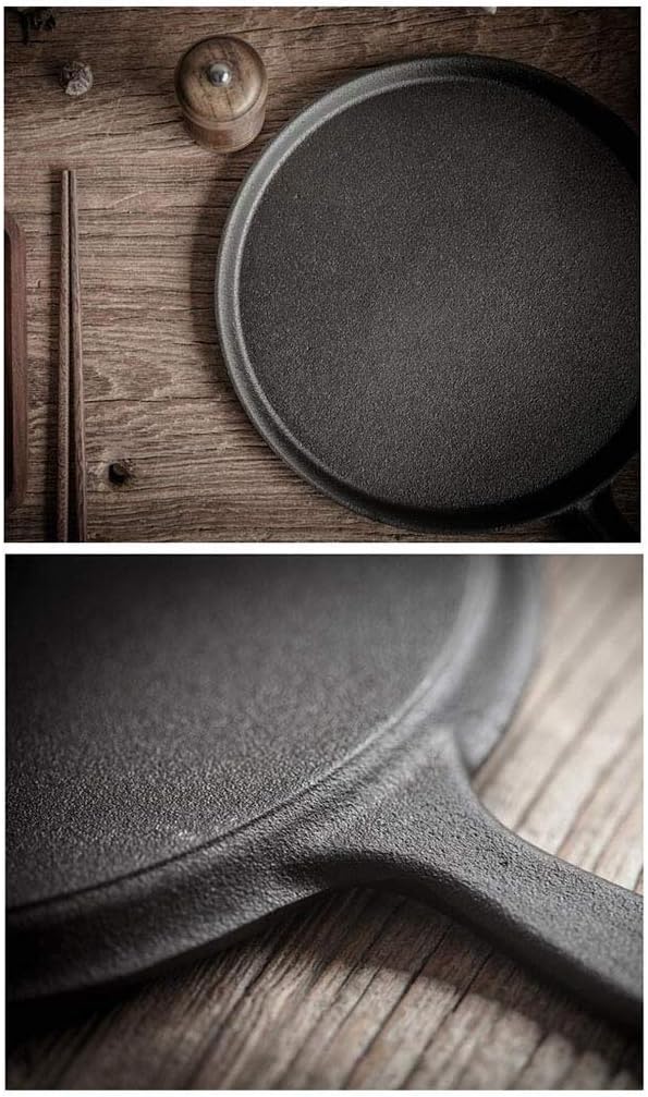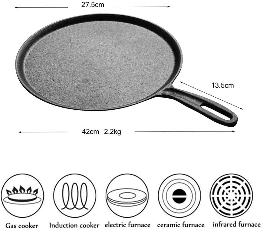 Features: Easy care, Hand wash, dry, rub with cooking oil, regular use and proper maintenance is the key to a coveted black non-stick surface. With our Pre-Seasoned Cast Iron cookware now cook all you can, whether it be steaks, paninis, vegetables or anything you like your tummies to be fed. Apply the rapeseed oil to the pot, and the rough surface of the iron pan to form a physical non-stick effect. Care Instructions: Clean the pot, dry it on low heat, and repeatedly wipe the inside of the pot with pig skin or cooking oil, stay for 5 hours or more, It can be used normally, when using, use wooden shovel or silicone appliance instead of metal shovel and steel wire ball. To heat the pot, then put the oil in the pot, stir-fry, in order to be physically non-stick. If there is water stain after using the pot, please dry and seal it to avoid rust, if there are conditions, evenly apply a layer of oil on the surface for better effect. Heating the pot will cause the handle to heat up, please use it carefully, beware of burns. Solve the problem of black food: stir-fry vegetables, do not put any spices and oil,dump the vegetables, the pot body is cleaned with a soft brush to clean the loose oil film in time. Heating the pot will cause the handle to heat up, and care should be taken during use to prevent burns. Product: Frying Pan Style: Europe Size: 27.5cm x 27.5cm, depth: 0.9cm, weight - 2.2kg, handle length: 13.5cm, pot length: 42cm Color: black Material: cast iron Notes: 1.Manual measurement, please allow slight error in size. 2.Due to differences in screen display, there may be subtle differences in color.