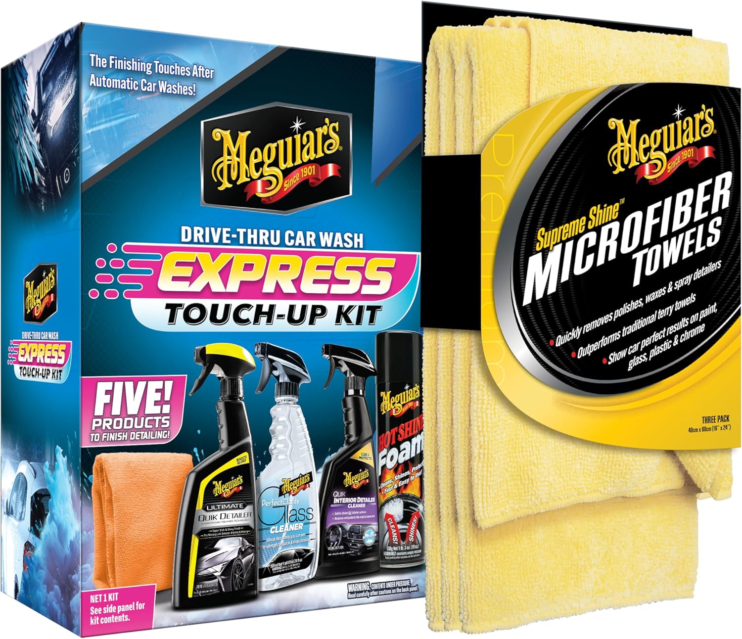 After going through an automatic car wash or washing your car at home, there’s always a spot that’s missed, drips that run down the paint, or even water spots. Meguiar’s put together the Drive-Thru Car Wash Express Touch-Up kit with the perfect, hand-selected product to put those final touches on your ride after washing. Touch up paint and exterior surfaces with Ultimate Quik Detailer. This premium spray detailer makes quick work of any water streaks and light grime spots that the automatic car wash leaves behind. Plus, it strengthens wax protection and enhances slickness and shine. Quik Interior Detailer is the perfect go-to for cleaning and protecting a variety of interior surfaces including vinyl, leather, plastic, rubber, metal, and even navigation and touch screens. Clean, protect, and restore the original appearance of these surfaces without a greasy look or feel. Perfect Clarity Glass Cleaner is a professional strength formula that quickly delivers streak-free perfect clarity. This anti-hazing formula easily removes dirt, bugs, tree sap, and bird droppings for lasting clarity. This unique formula spreads and wipes off quickly, with a superior cleaning ability to tackle even the dirtiest glass. Hot Shine Tire Foam lets you clean, shine, and protect tires in one easy step. Thick, active foam clings to tires, dissolving away build-up and leaving behind clean, shiny black tires. Hot Shine is a premium tire shine that cleans and shines your tires without water – just spray and walk away. Conditioner and UV protection to help keep tires looking like new. Also, included in this car cleaning kit as an additional bonus is a premium microfiber towel. To get the best results, consider using a different microfiber towel with each individual product.