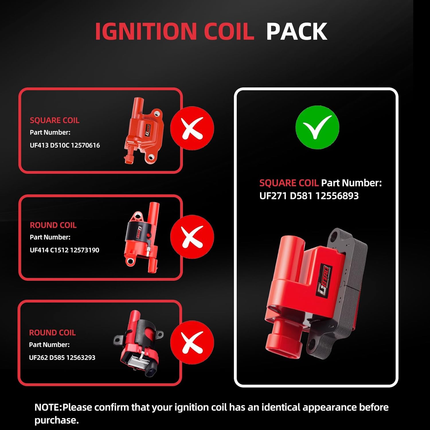 | Part Interchange Info | This ignition coil pack and spark plug wire harness can be used as a direct replacement for ignition coils with part numbers UF271, D581, 12558693, 12570553, 19299585, 41962, APP5243 in compatible engine applications for 1999-2007 Chevy Silverado 5.3L V8, 2002-2006 Chevy Avalanche 5.3L V8, 2000-2006 Chevy Suburban, 2000-2006 Chevy Tahoe 4.8L 5.3L V8, 2003-2006 Express 4.8L 5.3L 6.0L V8, 2000-2006 GMC Yukon 4.8L 5.3L 6.0L V8, 1999-2007 GMC Sierra 1500 4.8L 5.3L 6.0L V8, 2003-2005 GMC Savana 4.8L 5.3L 6.0L V8. |