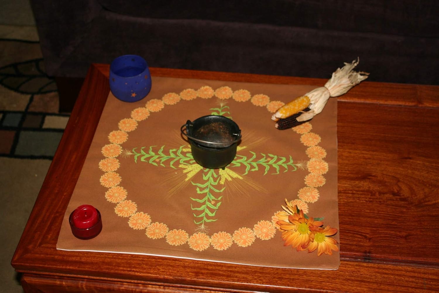 An original design by Artist Wendy Wilson of Magic in Your Living RoomA Pagan or Wiccan altar cloth of wheat, corn and sunflowers! This design celebrates the harvest of grain which is at the center of our life and civilization. It is designed for Lammas in the wheel of the year, but anytime is a good time to be thankful for our food. It shows corn and wheat which are the basis of our food supply and sunflowers, which provide food and beauty. The plants make a pattern symbolic of earth, the support of all life. Celebrate the harvest! This is a beautiful altar cloth, about 18 inches or 45cm square. professionally printed from my design. All my altar cloths are 2-ply, high quality printed cotton backed by cotton, for a nice weight on the altar. All altar cloths are available, as a special order, in any size up to about 34" square. The printing and sewing will take about 10-14 days. Just contact me with which design you want and what size. Prices scale with size. The altar tools and tarot cards are just for display purposes. All I am selling is the altar cloth.