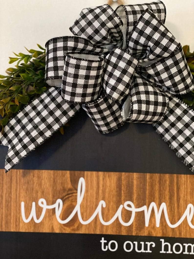 This is a beautiful 18" wooden door sign / wreath. It's not too heavy, can be hung on your door for a wreath! Fits great in between the storm door and entry door. It is brown and black, has raised wood lettering and has a beautiful white and black buffalo plaid burlap bow and greenery ( may differ ) on it.