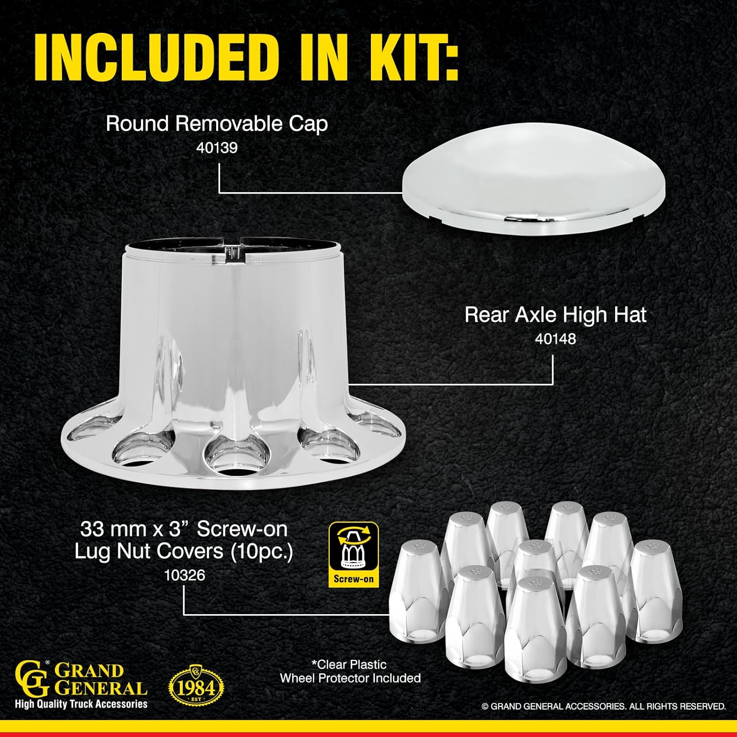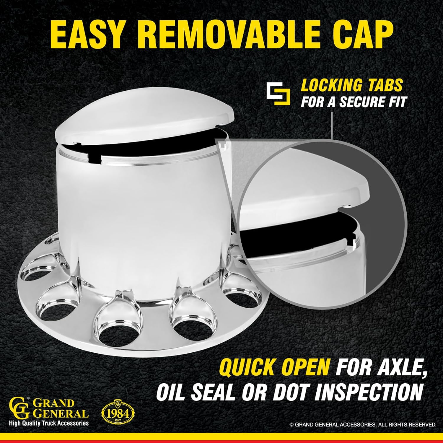 Customize your truck and take pride in your ride with Grand General's quality chrome ABS rear axle cover. The axle cover offers a quick and easy way to add value and beauty to your vehicle by concealing the center of the wheel and lug nuts. In addition, it also helps with the aerodynamics of the wheel.