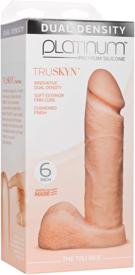 Truskyn Feel Real Tru Ride 6 inches Vanilla Dildo. From American legacy, Doc Johnson, the new reality in lifelike materials Truskyn, an iconic sensation. Actively creates the tender feel of real skin. Truskyn is pure, hygienic, health grade silicone that has been proprietorially handcrafted into a form that emulates actual skin, right down to warming to your own body temperature. Any way you pleasure yourself, The Tru Ride in Truskyn will deliver a true sensual experience. This ultra realistic cock utilizes a revolutionary dual density technique to combine a firm, flexible inner core with the feel of real skin to create the ultimate in lifelike fulfillment. With Truskyn your pleasure will feel real. Specifications: Dual Density Truskyn Feels Real Inside and Out. Firm Silicone inner core delivers stunning realness. Realistic cock design with balls and tapered phallic tip. Perfect for couples use or solo play. O ring harness compatible. Hypoallergenic. Nonporous and odorless. Phthalate free, body safe. Warms to body temperature. Easy to clean. Top rack dishwasher safe. Specifications: 7.1 inches, invertible, usable length 6.5 inches, width, diameter 1.7 inches. Material Silicone. Proudly made in America.