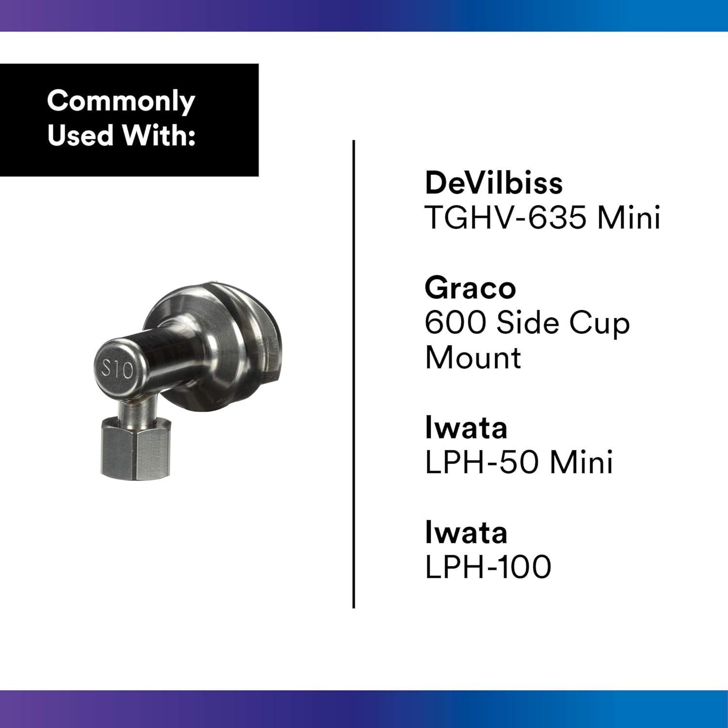 "3M PPS 2. 0 Adapter #S10 lets you use the PPS 2. 0 Spray Cup System with the following paint guns: Apollo A8200 and A8400; DeVilbiss FUN Gravity, JGX-501, JGX-502, TGHV-635 Mini; Graco 600 Side Cup Mount; Iwata LPH-50 Mini, LPH-100, RG3L Mini Air Brush, W-100G, W71 Gravity Side Mount; Meiji FSA Mini. Don’t see your gun? Use the chart images above to find your specific gun and the appropriate adapter model number. PPS 2. 0 adapters feature durable stainless steel construction, an improved lid-to-gun connection for more stability, and a wide bowl design for fast and easy cleaning. An adapter exists for almost any spray gun, so you can use the convenient PPS 2. 0 system without giving up your favorite gun. PPS 2. 0 features improvements like a quarter-turn locking collar with each lid, domed lid design for better spray performance and wider lid fluid spout. Each paint cup has convenient printed-on universal mix ratios for accurate mixing and a clear access window for easy visibility. Unlike with conventional aluminum or other metal paint cup systems, with PPS you don’t have to mix paint in extra cups and filter it into the paint reservoir, so you waste less paint. And with a fresh lid and liner for each mix, there’s less risk of outside contamination. By using this system, you can increase productivity in prep and cleanup time by as much as 50% and use up to 70% less cleaning solvent vs. conventional paint cup systems. "