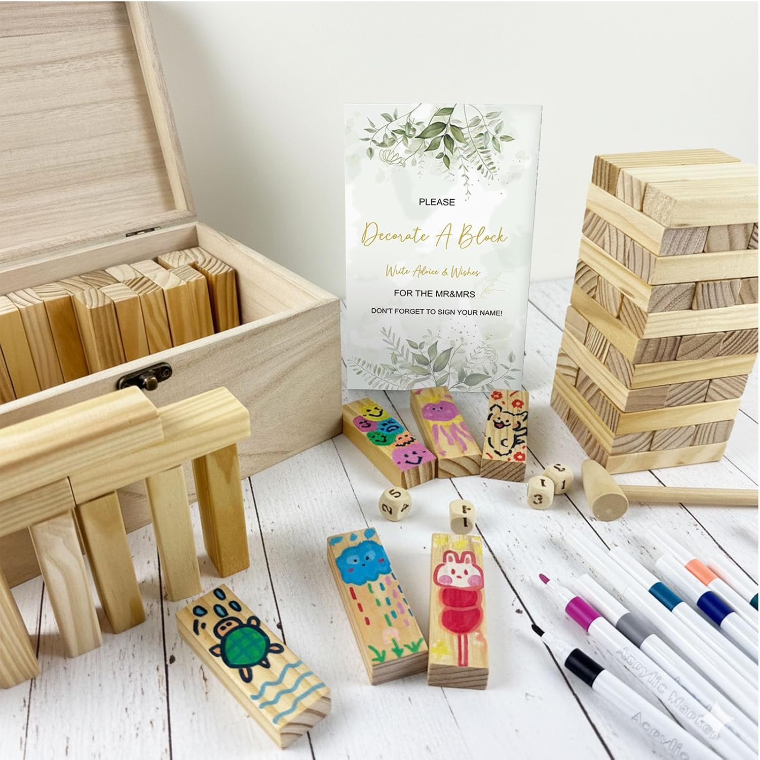 | Included Components | 70 long wooden blocks, 4 dice, 1 hammer, 24 colored markers, 1 Wedding shower sign, 1 wooden storage box |