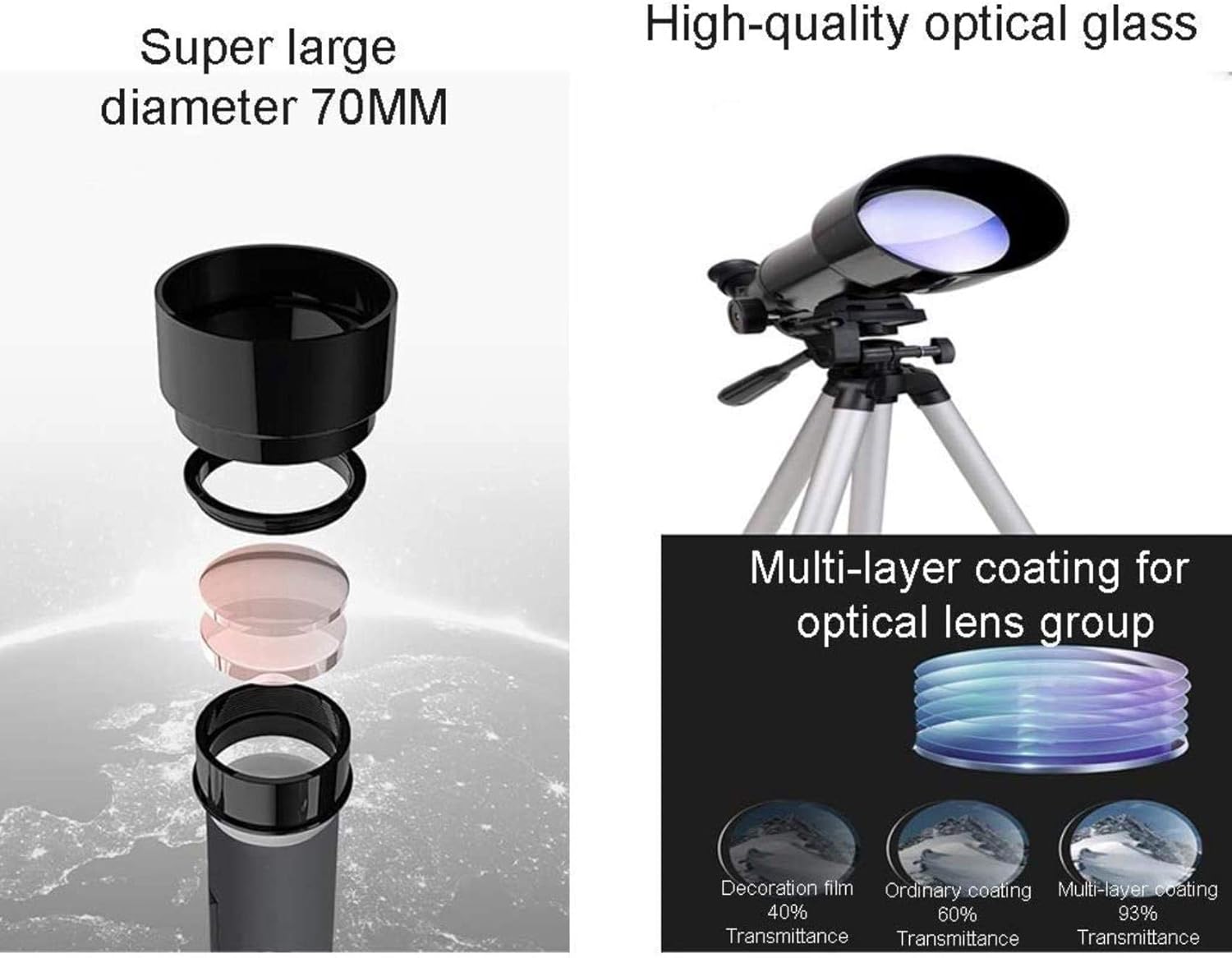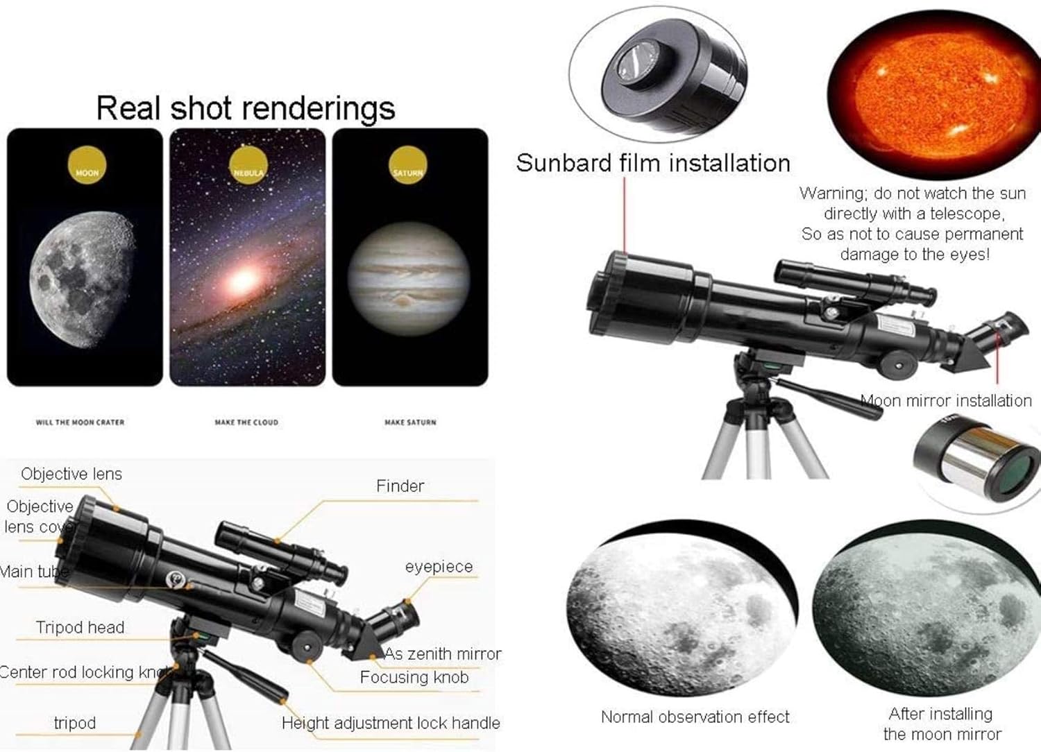 1. The refractor has a strong focal length, a large field of view, and a strong resolution.Multilayer optical coating,Refractive optical system,high light transmittance, and enhanced image brightness and clarity.Aluminum tripod 2. It is very suitable for astrometric work, and it performs well in observing the moon, planets, and binary stars. Easy to observe the ground view, very suitable for enlarged photography of the moon and planets 3. The telescope is suitable for beginners or children. It is easy to install and observe for beginners. It will encourage children to like learning space, get close to nature and stay away from electronic products. And provide a wonderful holiday or birthday gift idea for children who like science and astronomy. 4. If you have any questions about quality after receiving this space telescope, please contact us for the first time. We provide a high standard of 24/7 customer service, and will do our best to solve it for .