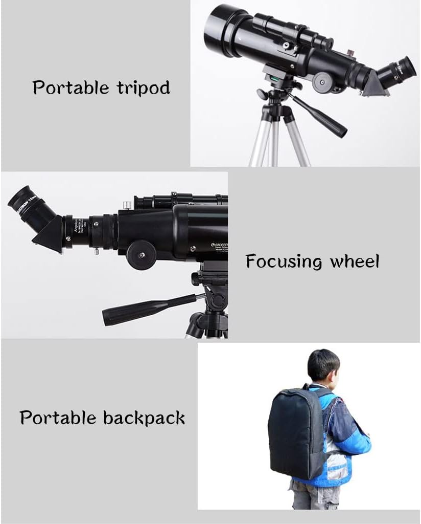 Start your journey of discovery! Here's a versatile telescope designed to pack up and go anywhere. It's excellent for daytime birding, nature study and scenic viewing, and will take you beyond the Earth's horizon for nighttime stargazing and Moon-watching.The best Christmas and holiday gifts for children! Product specifications Optical system: Refraction Product caliber: 70mm Focal length: 400mm Package Included: 1 telescope only Tip: We only sell telescope , not including other decorations. Due to problems with light, display, etc., the color difference of the product is normal. If you have any questions about the product, please leave us a message and we will get back to you within 24 hours. Note: This product is an amateur beginners telescope.