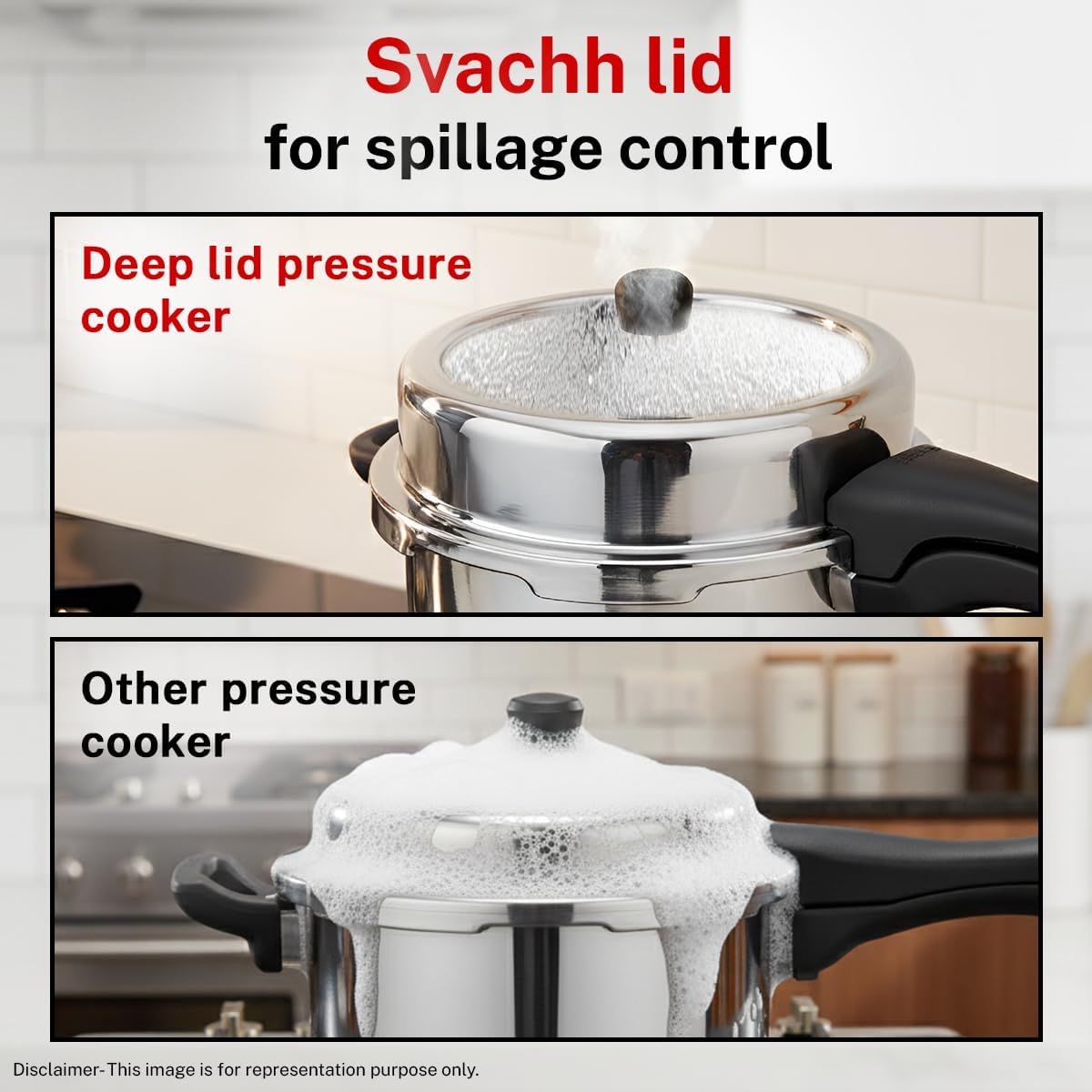 The Prestige Deluxe Alpha Svachh Pressure cookers are made using the best quality Stainless steel which makes it perfect for any kitchen Its unique Alpha base is designed for even distribution of heat and is also induction compatible What's more it also features built-in safety mechanism in the form of pressure indicators safety plug and controlled Gasket-release system Also the Svachh lid contains any spillage that might occur during the course of cooking and prevents the messy liquid from dripping down So go ahead and bring home the Deluxe Alpha Svachh Stainless Steel Pressure cooker it's yet another Prestige Product you can trust