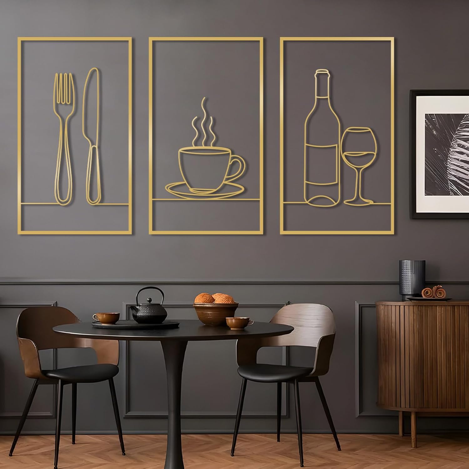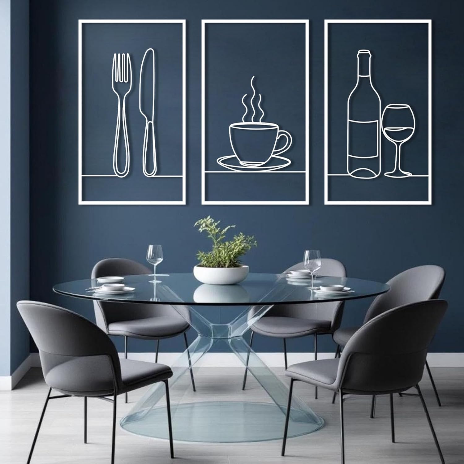 3Pcs Minimalist Line Kitchen Metal Wall Art - Knife, Fork, Coffee Cup, Wine Bottle, Goblet Decor, Knife Fork Metal Wall Decor, Dining Room Wall Hanging, Kitchen Line Art Product Feature ①Metal wall decoration breaks the limitations of traditional decoration, offering greater strength and durability. The distance between ornaments and walls can create lighting and shadow effects that other decorations cannot achieve. ②3Pcs minimalist line kitchen metal wall art blends with the interior style under the premise of simplicity and elegance, highlighting specific spaces and making the space more layered and artistic. ③In addition, it is also a gift with taste, having high collection and commemorative value, suitable as a gift for line art enthusiasts. Specifications: Color: Electrostatic powder coating (matte) - Black, White, Gold and Silver. Product Material: 2 mm / 0. 08" metal - Quality lightweight 14 gauge metal. Easy installation: You can use the screw to install our wall sculpture decoration, convenient for you to use and install. 3Pcs Minimalist Line Kitchen Metal Wall Art Size (Each Panel): 19"x11"/47x27cm 24"x14"/60x35cm 30"x17"/76x44cm 35"x21"/90x52cm 41"x24"/105x61cm 48"x28"/121x70cm 53"x31"/135x78cm 59"x34"/150x87cm Package Includes: 1 x 3Pcs Minimalist Line Kitchen Metal Wall Art; 1 x Installation Kit Care Instructions: Our products are made of pure metal and are sprayed with a matte paint. This means that most of my products are rust-proof! to clean up, just wipe with a damp cloth. Notes: Because this product is hand-measured, the size will have some minor errors. Actual colors may vary slightly due to differences in mobile phone or computer display screens, as well as environmental factors in which photos were taken. .
