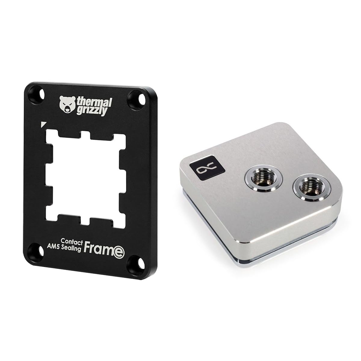 This bundle includes the Core 1 CPu Water Block and Thermal Grizzly AM5 contact frame. With the Core 1, Alphacool presents a new generation of CPu water cooling. The latest desktop processors are constantly becoming more powerful, but they also produce more and more waste heat. The Core 1 reliably solves this problem with the help of its completely newly developed 3D jet plate, which is also used in industry. The CPu water cooler, made entirely of metal, not only impresses with its elegant appearance, but also has a new mounting system that simplifies installation. Compatibility: Intel: LGA 1700 AMD: AM4 / AM5 Technical specifications Dimensions: (L x W x H) 72 x 72 x 26.50mm Material cooler: nickel-plated copper Material housing: Brass Material connections: nickel plated brass Connections: 2 x G1/4" The AM5 Contact & Sealing Frame is a combination of Contact Frame and CPu-Guard for AMD's Ryzen-7000 processors. As a Contact Frame, the AM5 Contact & Sealing Frame creates optimal contact pressure of the CPu into the socket, while an optional, included inlay made of silicone foam serves to protect the exposed components on the CPu. Innovative Silicone Foam Inlay for Protection and Sealing The AM5 Contact & Sealing Frame comes with a silicone foam inlay. This can be placed on the PCB of the processor, similar to the AMD Ryzen 7000 CPu Guard. When installing the AM5 Contact & Sealing Frame, the gap between the heatspreader and the aluminium frame is sealed by the silicone foam by pressing the foam onto the PCB. This prevents thermal paste or liquid metal from getting onto the CPu's unprotected components. The foam inlay is optional when used with thermal pastes, but mandatory when used with liquid metal. Model: TR-13443-99087