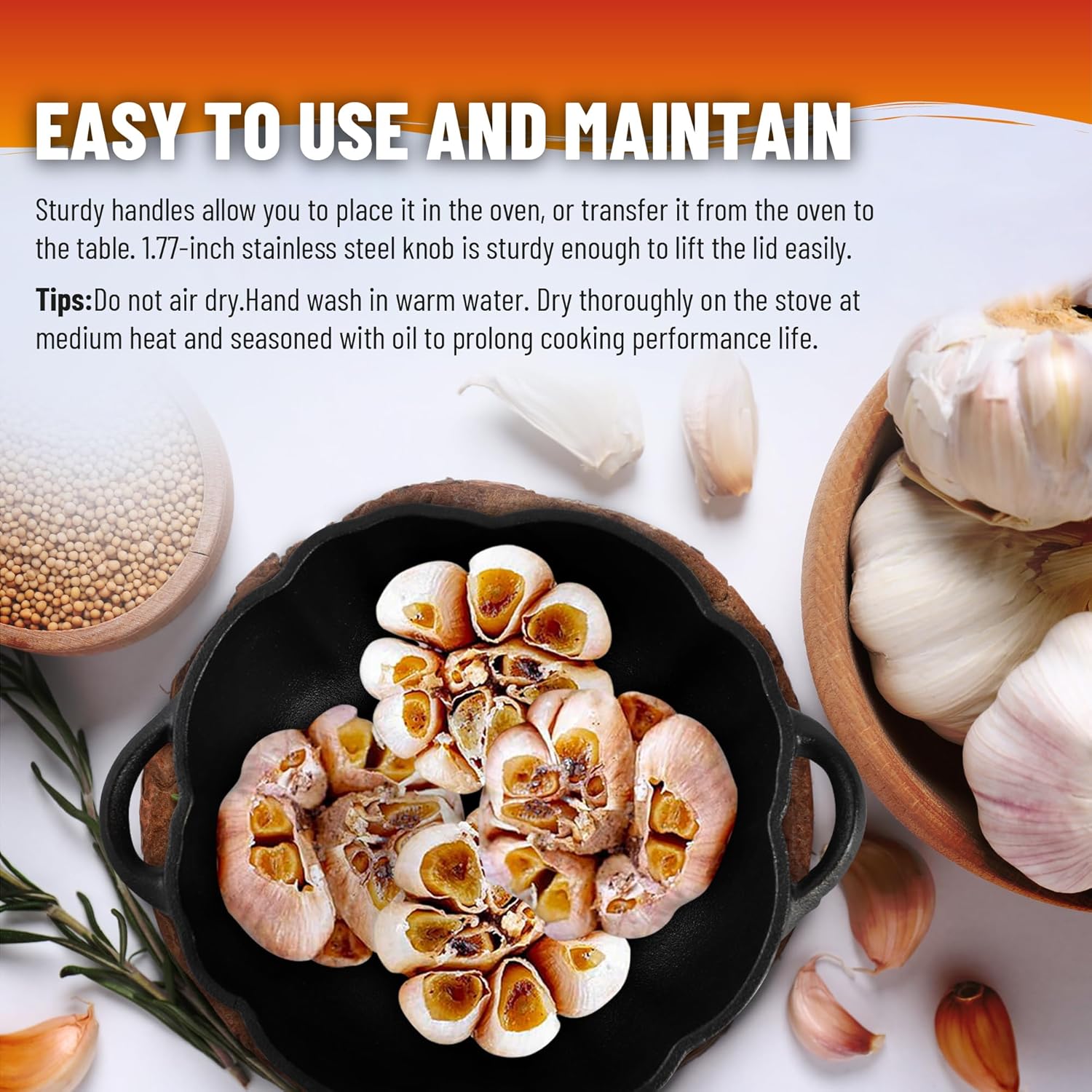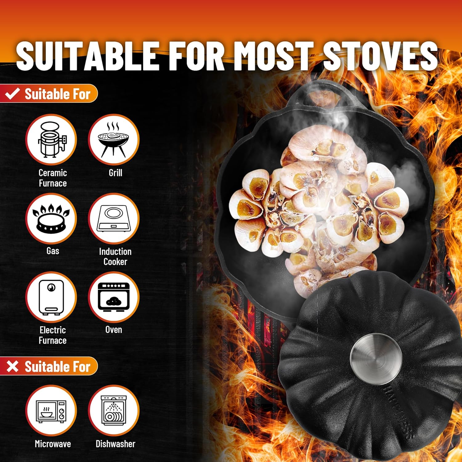 Pre-seasoned Cast Iron Garlic Roaster, Heavy Duty Garlic Roaster with Lid, Pumpkin Shaped Garlic Baker Garlic Cooker for Oven, Grill, Stove, BBQ, Barbecue (8.66” L x 7.08” W x 5.12” H/Black)
