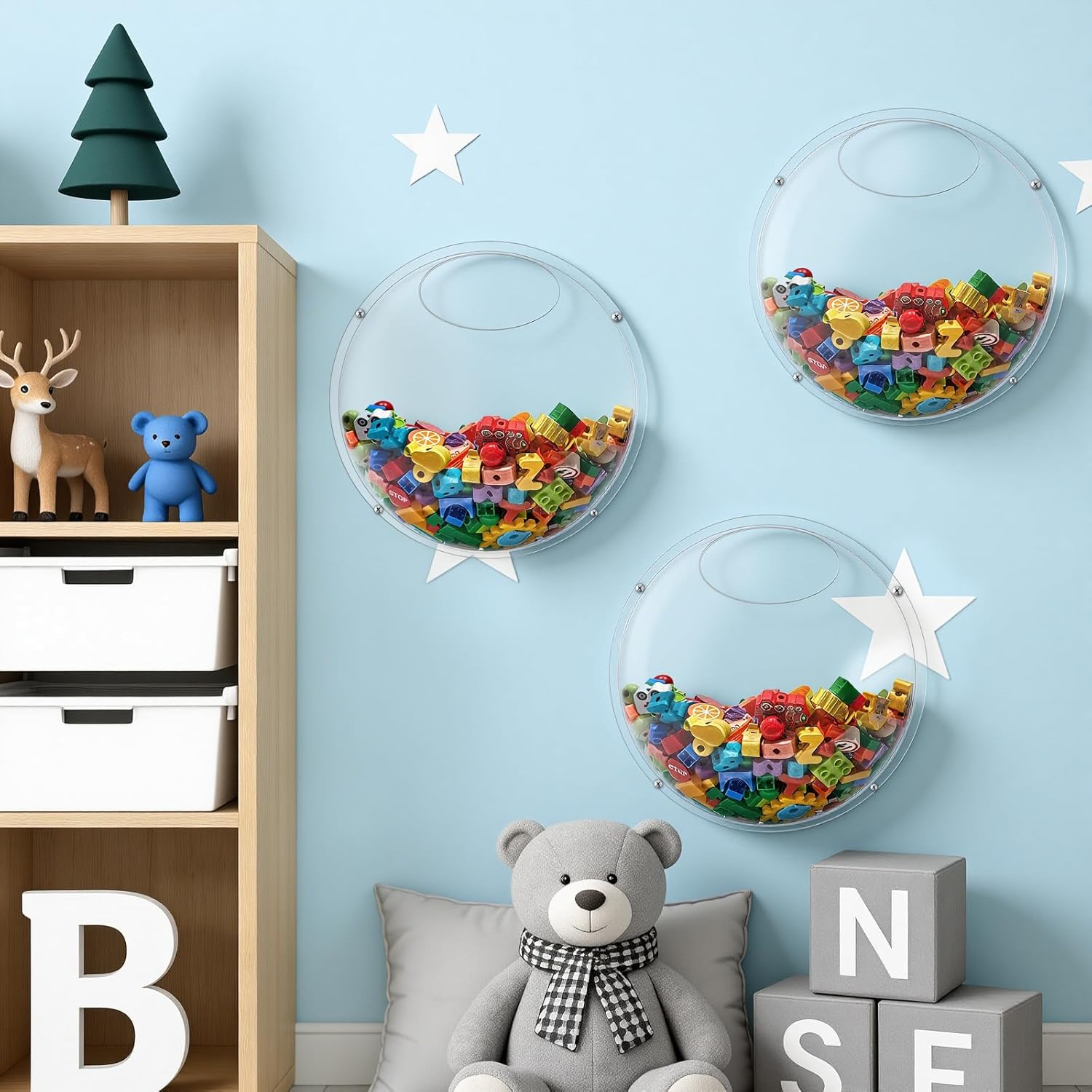 Our transparent acrylic toy dispenser measures 12.5"L x 12.5"W x 5.9"H, combining simple, functional design with tidy storage. The high-clarity acrylic construction is sturdy and long-lasting while keeping toys, stationery, and craft materials clearly visible for fast selection and restocking. Designed as flexible toy wall storage or a freestanding desktop unit, the round back panel improves stability and makes installation straightforward. The dispenser mounts with only four screws—choose proper anchors for your wall type to ensure a secure fit. Perfectly sized to organize building blocks, toy cars, pens, glue, stickers, and other small accessories, this toy storage organizer helps children develop good sorting and organizing habits. Whether used at home, in a playroom, in a preschool classroom, or as part of a retail display, this acrylic unit is an attractive, practical addition to any toy organizers and storage setup. Easy to clean, durable, and beautifully transparent—make tidying up simpler and more enjoyable.