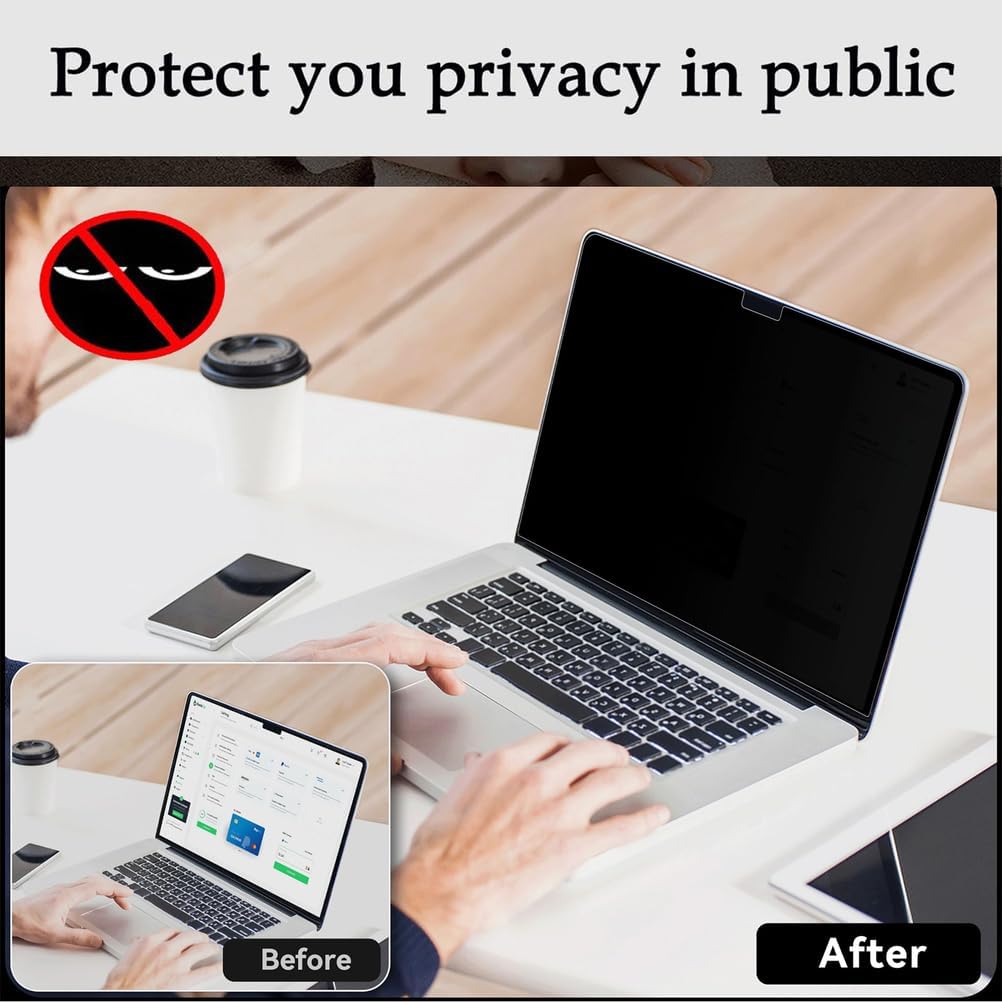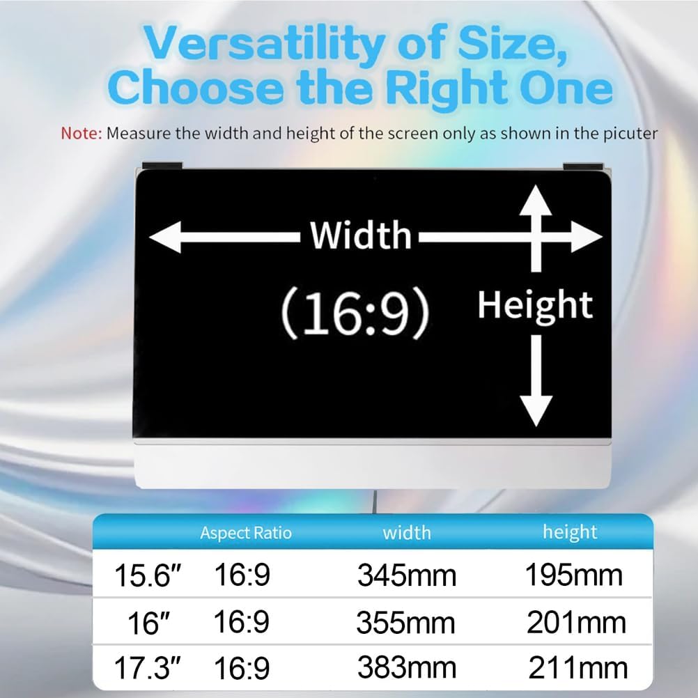 Features:✔Full screen size protects in all directions.✔Perfectly clear view while you directly in front of the screen.✔Full screen privacy screen filter works safely in public place.✔Block the visibility from side views to ensure maximum privacy protection.✔High definition with special angle cutting, no grain HD and the picture is real without deformed.SpecificationsMaterial: P.E.TSize:15.6inch(345mm*195mm)16inch(355mm*201mm)17.3inch(383mm*211mm)Package included1* magnetic laptop privacy screenTips:If you want a better privacy effect, please set a lower brightness on your computer accordingly, the lower the brightness, the better the privacy effect.