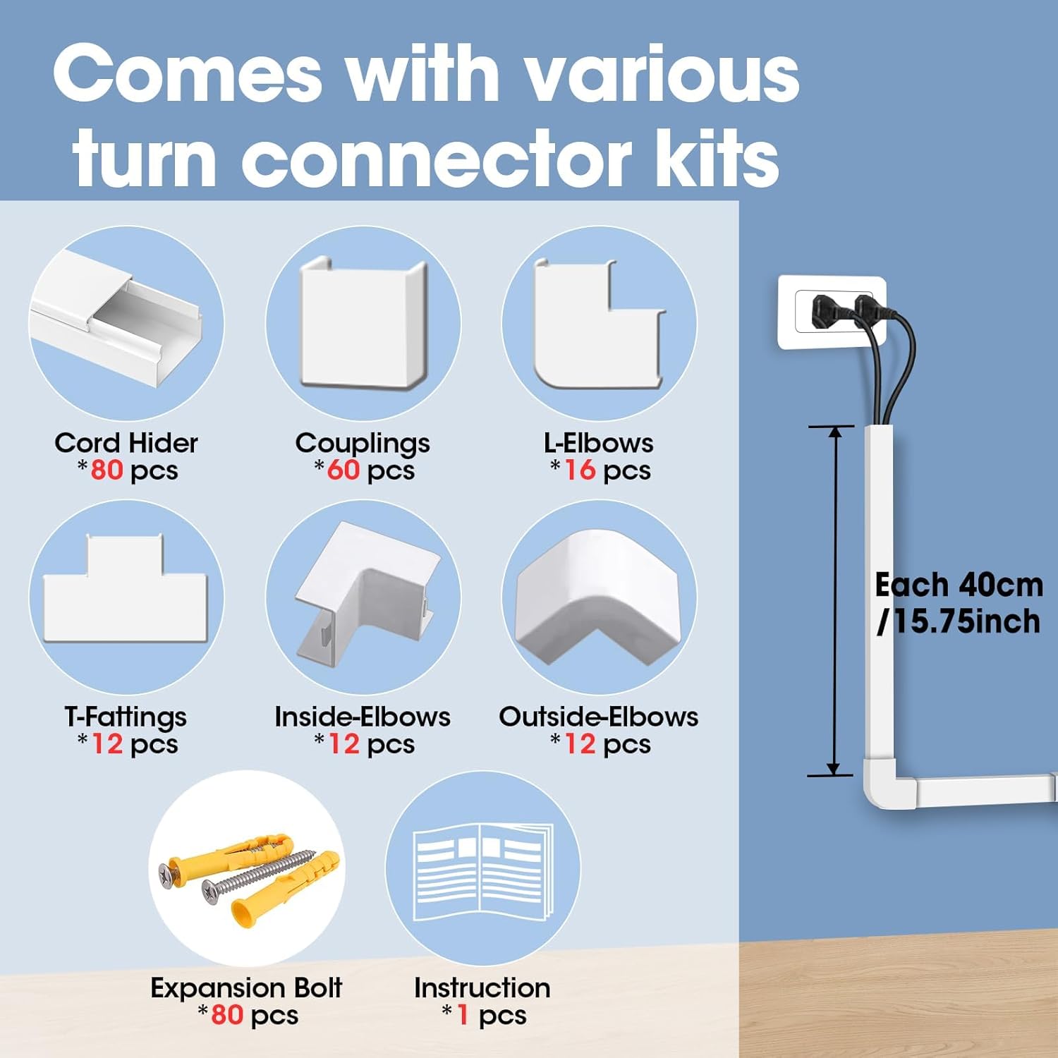 1260in Cord Hider Kit, Cord Covers for Wires on Wall, Paintable Cable Raceway, Cord Hider for Wall Mount tv, tv Cable Hider Wall kit, Wire Covers for Cords, 80X L15.75 X W0.96in X H0.57in, White