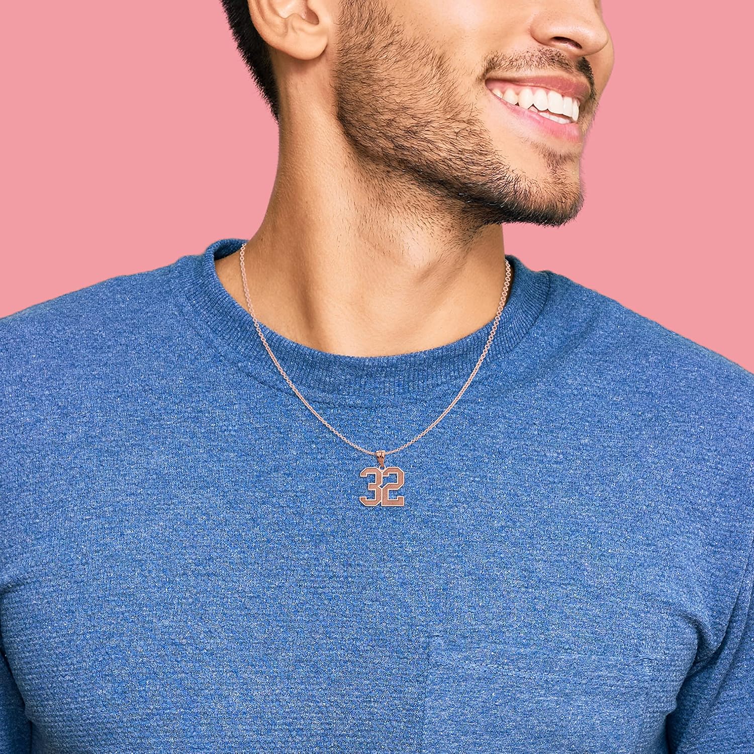 This handcrafted piece of fine statement jewelry is created by talented USA based artisans out of gleaming 14 karat rose gold. The design measures approximately 1" and features your choice of any two digit number from 00-99. The numbers are crafted with a slightly raised high polished border and a heavily textured interior. Every detail is rendered in stunning perfection. The reverse of the charm can be customized with text up to 11 characters in length. There are four available fonts to choose from. The pendant comes in choice of a 16”, 18”, 20" or 22” long chain to customize your necklineThe custom number themed charm is suspended from a polished fluted bail which will fit a chain up to 3.5mm. Gift your favorite athlete their jersey number personalized with their name or sports team name engraved on the back of the charm.