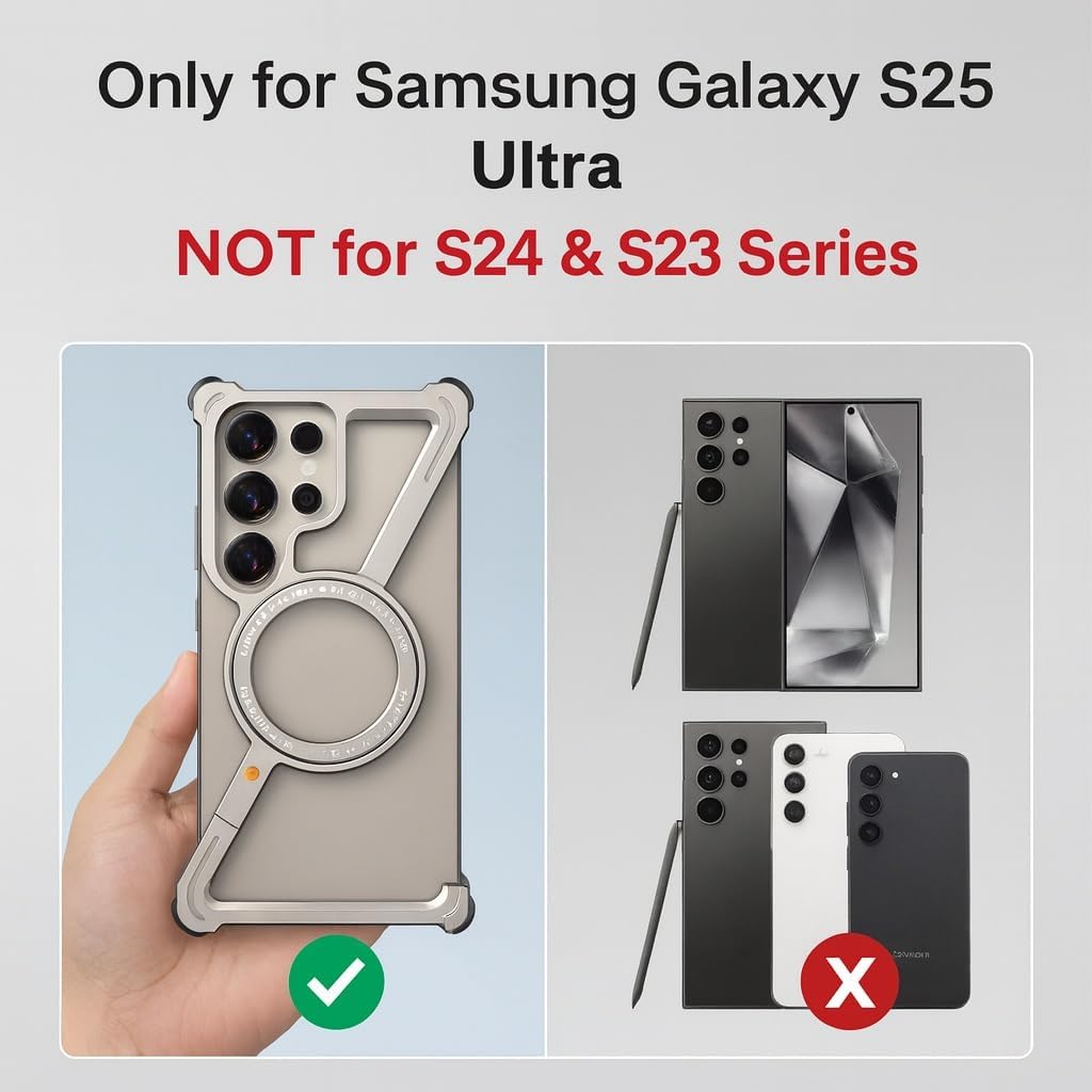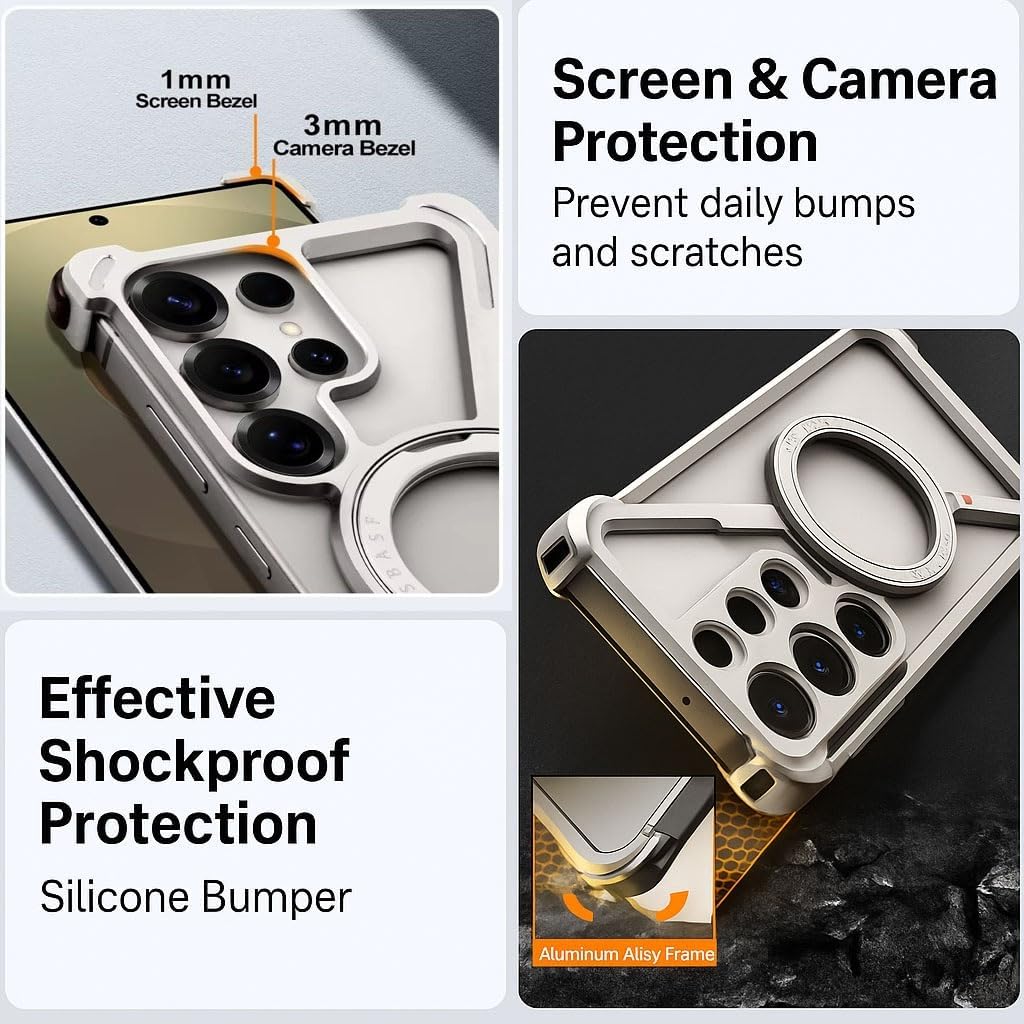 NEW VERSION – DESIGNED FOR GALAXY S25 ULTRAUpgrade your phone protection with our frameless Z-shaped bumper case. Minimalist in design yet powerful in function, it offers the perfect balance of slim style and reliable defense.Luxury Meets FunctionalityMade from aviation-grade aluminum alloy, this case is ultra-light yet tough. The unique Z-style open structure enhances airflow for efficient cooling and gives your phone a futuristic, eye-catching look.Invisible Kickstand, Always ReadyThe magnetic O-ring stand rotates a full 360° and flips 120°, letting you switch between portrait and landscape with ease. Ideal for streaming, gaming, or video calls, and compatible with magnetic car mounts for driving convenience.Engineered Shockproof ProtectionFour reinforced corners absorb impacts, while the 3mm raised camera frame and 1mm front lip protect against scratches and drops. Every edge is designed for complete 360° coverage without extra bulk.Product HighlightsFrameless Z-style aluminum alloy bumper360° rotating magnetic O-ring kickstandSlim and lightweight with improved heat dissipationRaised bezels for camera and screen protectionQuick snap-in installation with release buttonMinimalist design with precise cutoutsPackage Contents1 × Metal Bumper Case (for Samsung Galaxy S25 Ultra)