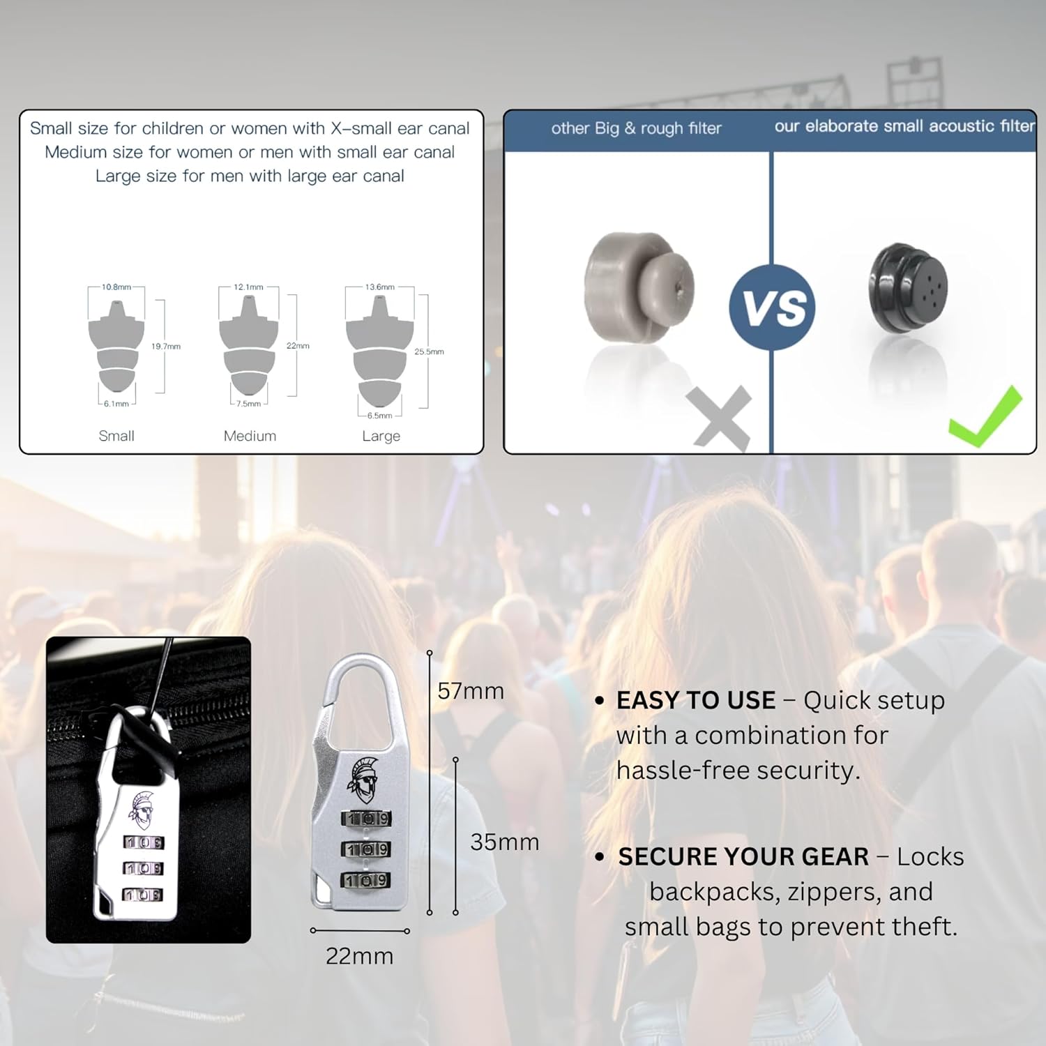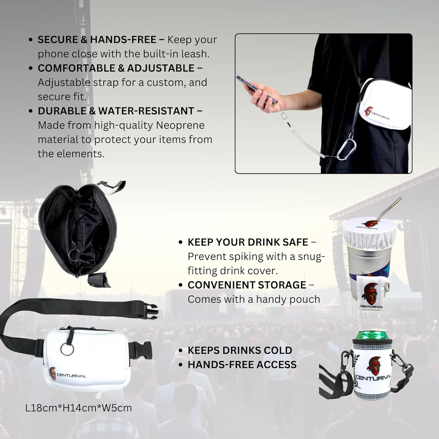 | BuiltIn Media | Anti-Theft Phone Strap, Mini Lock, Fanny Pack with Phone Leash, Drink Cover, Can Cooler, Bottle Opener, High-Fidelity Earplugs |