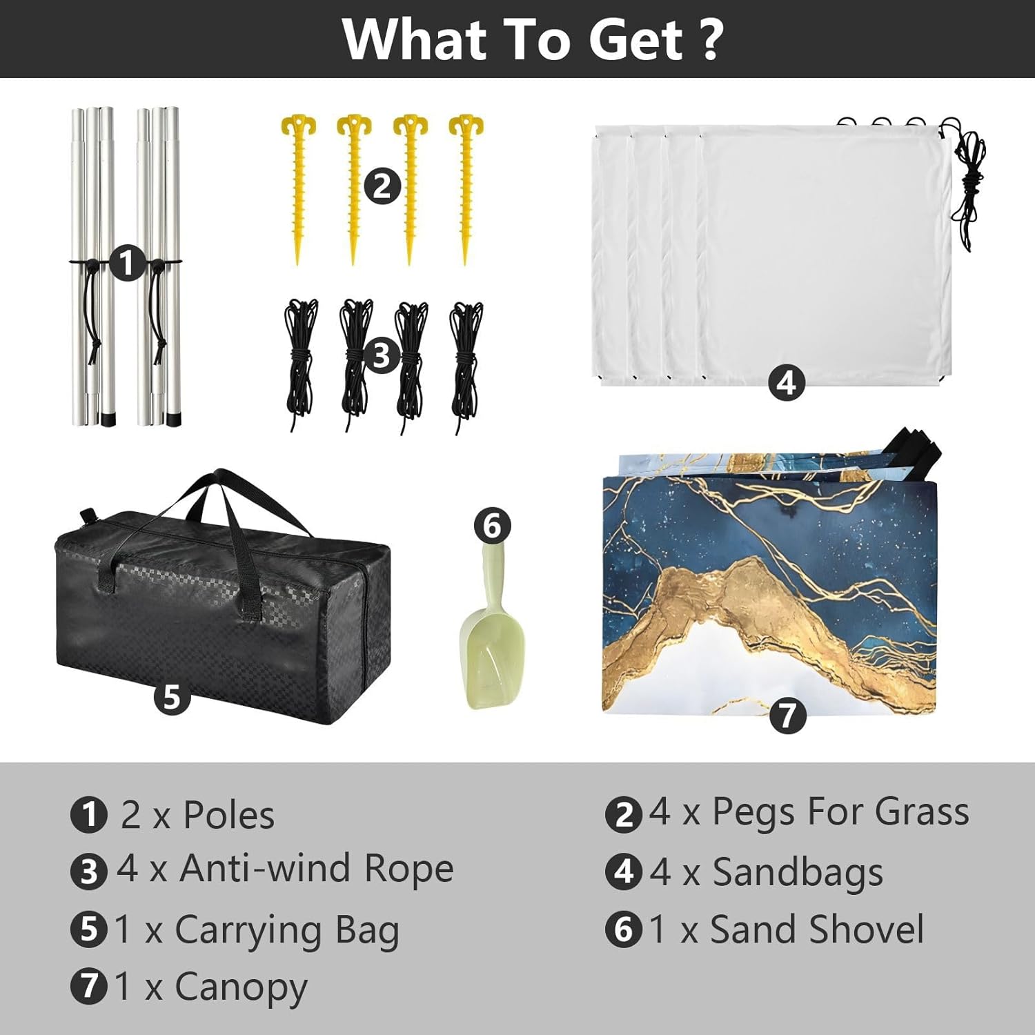 Unpack Cooling trip in 10 minutes! Our 280x320cm beach tent features silver-coated polyester oxford fabric that actively deflects heat while providing UPF 50+ protection-say goodbye to sunburns and squinting! Express your style with eye-catching, tropical-inspired prints that transform ordinary shade into a vibrant oasis. Engineered for stubborn coastal winds, the reinforced frame supports extra guy ropes alongside the included 4 refillable sandbags (use the free shovel!), 4 heavy-duty steel stakes, and 4 reinforced ropes. This high-grade anchoring system laughs at 25mph gusts while you relax. Adventure Beyond Sand: Beach lounging Lakeside camping Park picnics Fishing trips Festival hangouts Backyard "staycations