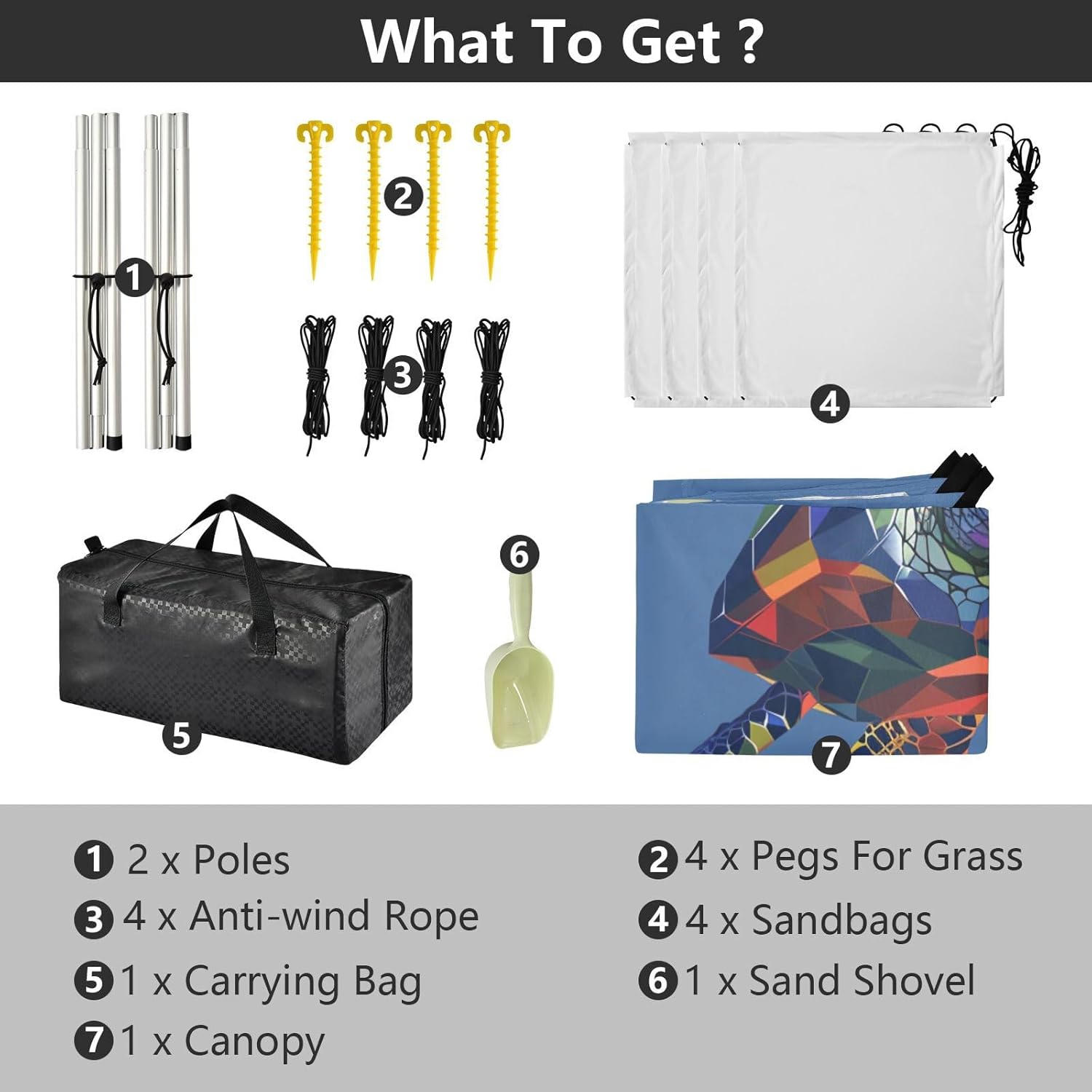 Unpack Cooling trip in 10 minutes! Our 280x320cm beach tent features silver-coated polyester oxford fabric that actively deflects heat while providing UPF 50+ protection-say goodbye to sunburns and squinting! Express your style with eye-catching, tropical-inspired prints that transform ordinary shade into a vibrant oasis. Engineered for stubborn coastal winds, the reinforced frame supports extra guy ropes alongside the included 4 refillable sandbags (use the free shovel!), 4 heavy-duty steel stakes, and 4 reinforced ropes. This high-grade anchoring system laughs at 25mph gusts while you relax. Adventure Beyond Sand: Beach lounging Lakeside camping Park picnics Fishing trips Festival hangouts Backyard "staycations