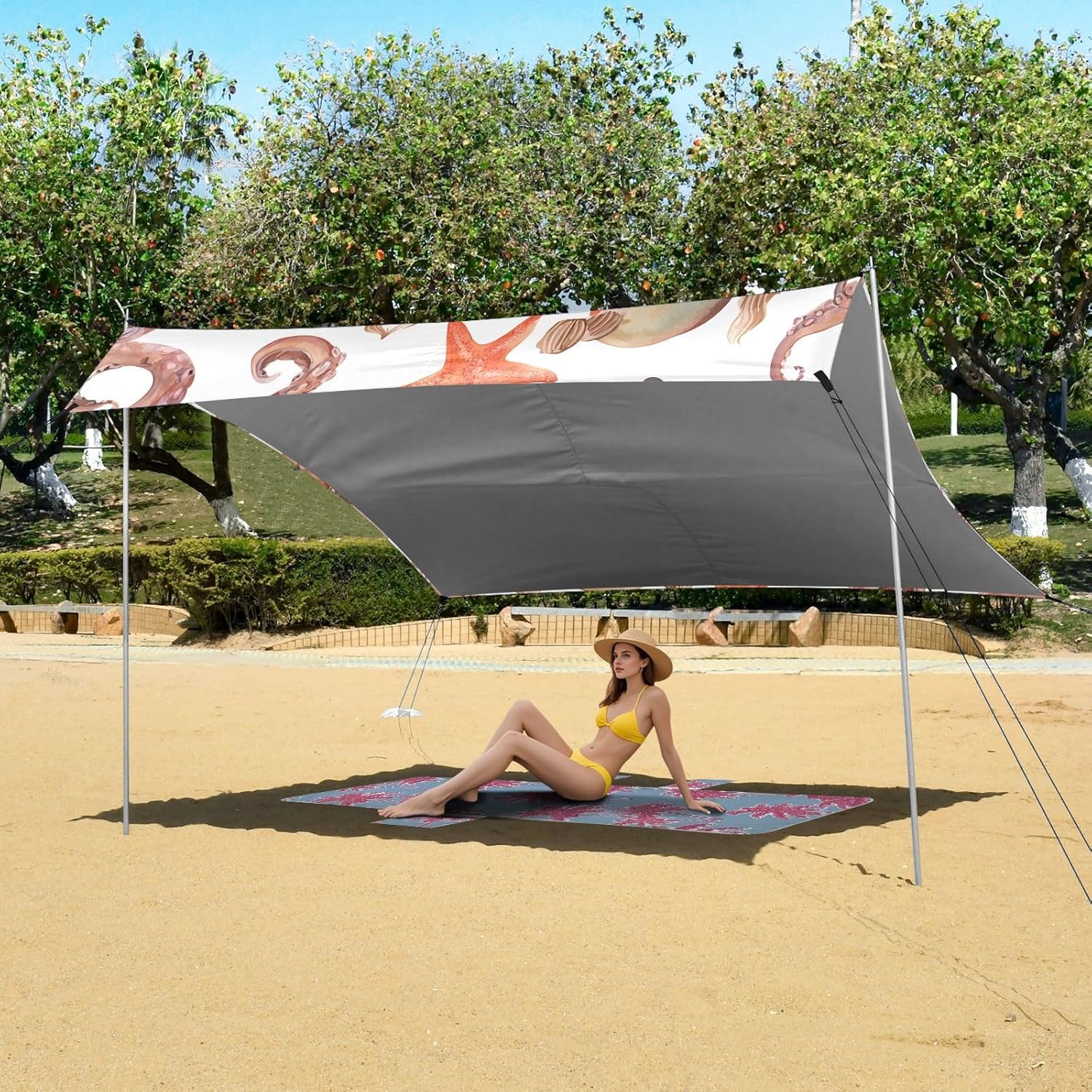 Unpack Cooling trip in 10 minutes! Our 280x320cm beach tent features silver-coated polyester oxford fabric that actively deflects heat while providing UPF 50+ protection-say goodbye to sunburns and squinting! Express your style with eye-catching, tropical-inspired prints that transform ordinary shade into a vibrant oasis. Engineered for stubborn coastal winds, the reinforced frame supports extra guy ropes alongside the included 4 refillable sandbags (use the free shovel!), 4 heavy-duty steel stakes, and 4 reinforced ropes. This high-grade anchoring system laughs at 25mph gusts while you relax. Adventure Beyond Sand: Beach lounging Lakeside camping Park picnics Fishing trips Festival hangouts Backyard "staycations