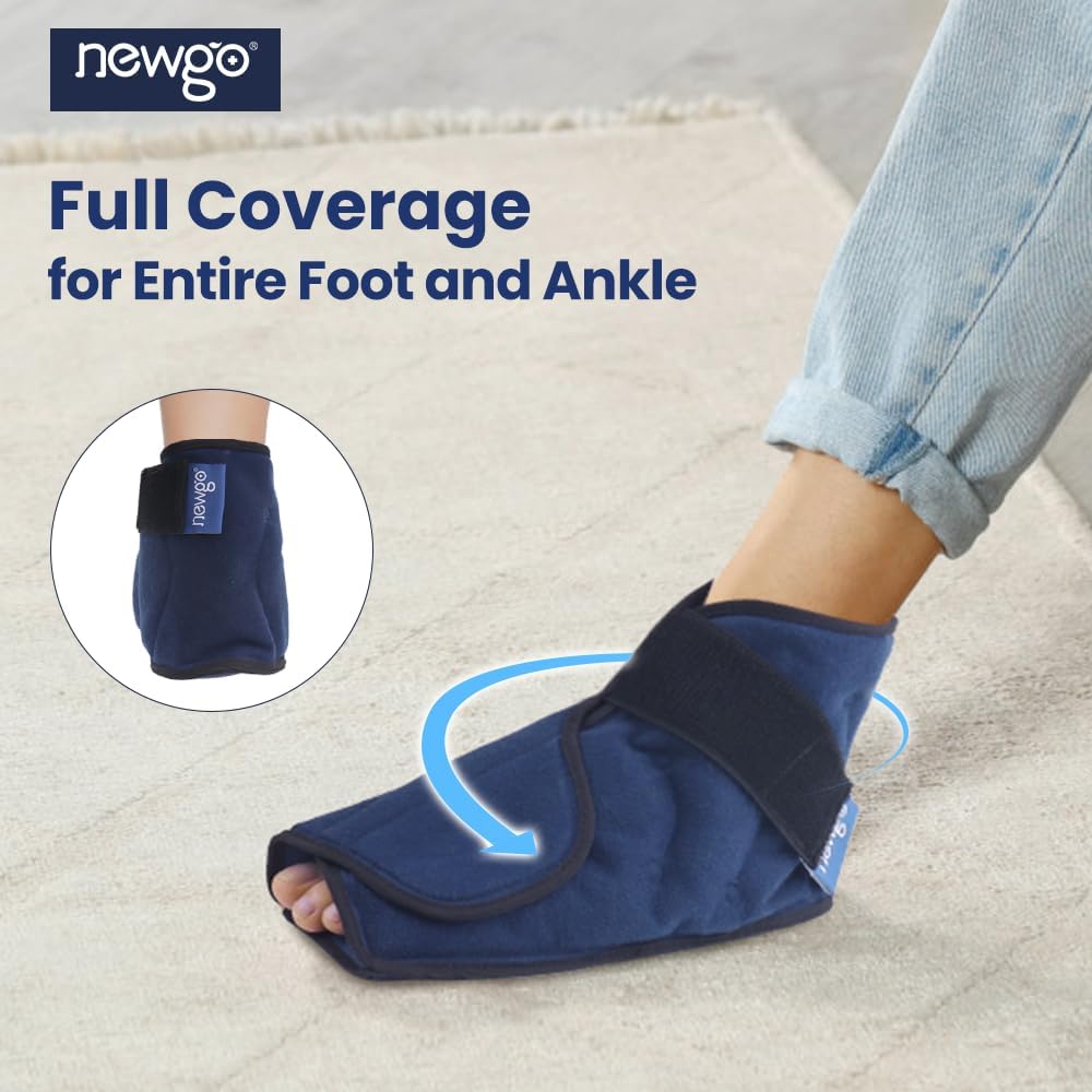 Heat All Over Your Foot - If your feet get cold easy, and are often either numb or painful, these booties are perfect for you. The outside is velour, the inside is soft fleece, NEWGO microwavable foot warmers are great for warming up your cold feet. The foot warmers have walnut sand throughout -the top of foot, bottom of foot and around the ankles which offer heat all around the foot and ankle, not just on the bottom.Grab yourself a pair of these microwave booties and relax in cozy comfort. Natural Pain Relief- The heat therapy foot booties are filled with 100% natural walnut sand to provide soothing warmth and comfort, so you'll be experiencing like a foot spa at home. The warm slippers deliver soothing, long-lasting, deep-penetrating moist heat, help to promote blood circulation and improve foot flexibility. Microwave booties are recommended for foot and ankle pain relief, joint pain, cramps, stiffness, heel pain, tendinitis, plantar fasciitis or get relaxed during taking a rest. Adjustable Shoe Lace Design - These foot booties fits US Men's Size 13#, US women's size 14#. With shoes lace design make it easily to adjust the tightness and keep it in place. Easy Slip-On/Off - The foot ice packs for injuries reusable is built-in-one piece design and features widen round velcro fastener to secure your instep which makes it easy to wear for swollen or injured foot, no more troublesome wearing steps, user friendly for the elderly, people with poor back flexibility or with injuries. Effective Relief with Full Coverage - The plantar fasciitis ice boot fully covers all areas where the pain occurs and provides instant cooling relief for the entire foot - ankle, heel, in-step, achilles tendon and the bottom of the foot. Full coverage design makes it a perfect solution for foot ankle surgery recovery, swelling, broken ankle, plantar fasciitis, achilles tendonitis, arthritis, sprained ankle, foot fracture, neuropathy foot and more!