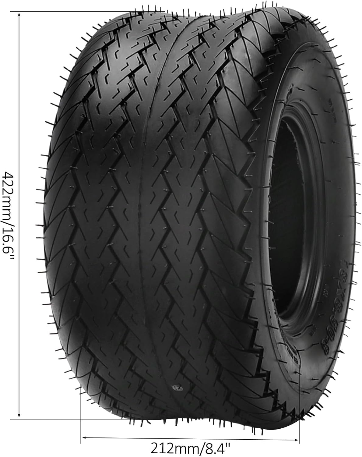 Tire: 18x8.50-8, 18x8.50x8, 18x8.5-8 Tire Height: 422mm (16.6"), Width: 212mm (8.35") 4PR tube type, max load 815lbs, 22 P.S.I, Load Rating at 15 bar Replacement for go kart, quad ATV, UTV, mini bike, buggy, lawn mower, garden tractor, moped, 4 wheelers and ect. All Terrain: Tailored for all types of terrains, including mud, sand, and rocky landscapes Package includes – 1 x tire, 1 x inner tube