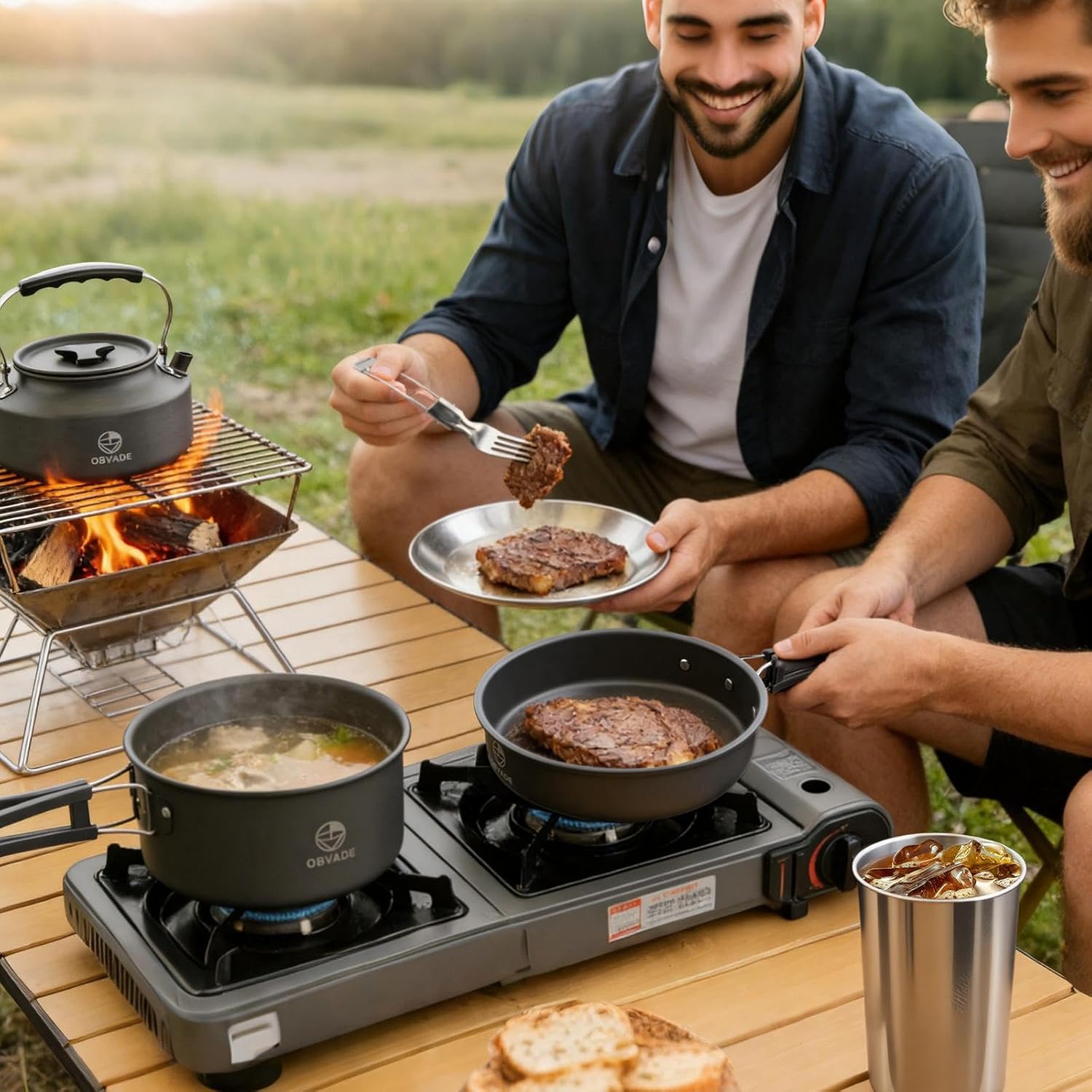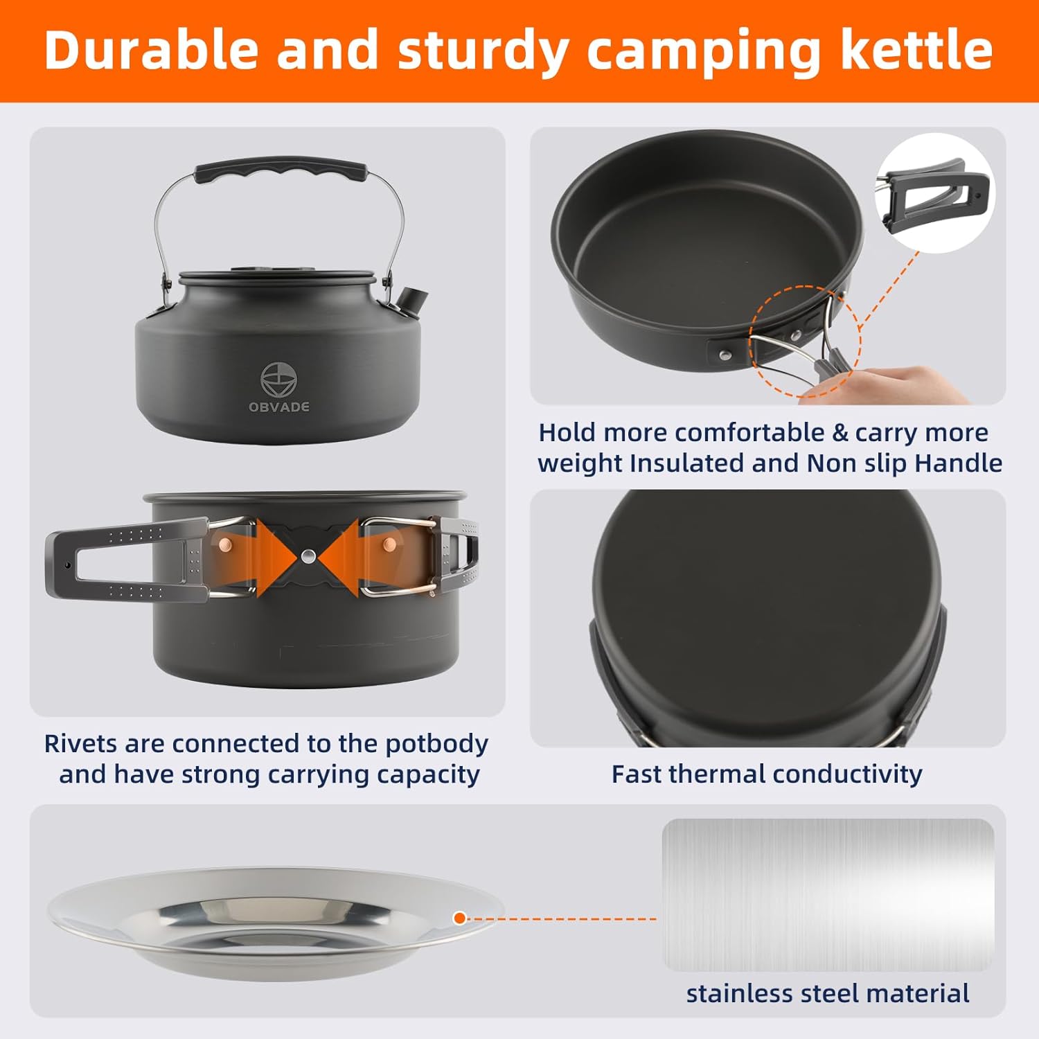 Ready for Your Next Outdoor Adventure? Upgrade your camp kitchen with the OBVADE 17-Piece Camping Cookware Set. Designed for durability and portability, this aluminum camping pot and pan set is the essential companion for everyone from solo backpackers to family campers. Why This Kit is a Trail Favorite: All-in-One Convenience: No more forgotten forks or cups. From the tea kettle to the cutlery, every item is trail-tested for efficiency. Built for the Elements: Our backpacking cooking gear is non-stick and easy to clean, even with limited water. Space-Saving Design: The nesting feature makes it an ideal compact cookware choice for tight backpacks or emergency bug-out bags. Specifications: Material: Hard-Anodized Aluminum, Stainless Steel, Silicone Weight: 2.75 lbs | Packed Size: 7.5" x 7.5" x 5" Includes: Pot, Kettle, Frying Pan, 2 Cups, 2 Plates, 2 Cutlery Sets, Accessories.