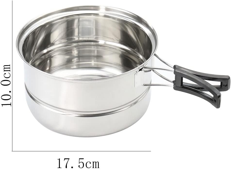 Use stainless steel, beautiful and easy to clean.Very light, easy to carry, convenient and practical.Uniform heating, fast heat conduction, induction cooker, gas stove universal.Multi-purpose combination, humanized, satisfying various cooking methods such as cooking, frying, frying, steaming, etc. big pot, small pot, steaming slice, suitable for 1-2 Use for fried egg, can cook, very convenient.Outdoor barbecue for support, team and family camping, picnic, campfire use.Specifications:Name: Portable Cookware SetMaterial: stainless steelPot Size:17.5*10cm(D*H)Pan Size:16.5*4.5cm(D*H)Packing List:1 * Outdoor Cookware SetNote:To avoid being scalded,it is recommended not to use the pot on a large flame to prevent sclading caused by the anti-scald plastic protective case on the handle being burnt.Light shooting and different displays may cause the color of the item in the picture a little different from the real thing. The measurement allowed error is +/- 1-3cm.Our utensils are also dishwasher-safe and are made to withstand years of constant use.