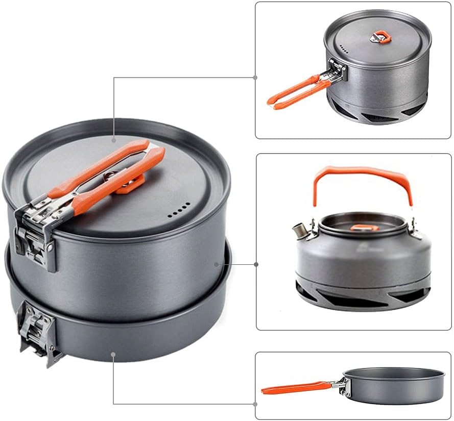Cookware set High efficiency cooking pot set for family camping (tent camping), super and compact outdoor tableware. Features: Compact design. handle. Heat exchanger. Easy to use and operate, bringing you great convenience. A good choice as a gift for your friends, they will like it. Size: Pot: Ф168*111mm Fry Pan: Ф174*42mm Kettle:Ф153*86mm Package includes: 1*0.7L Fry Pan 1*1.5L Pot 1*0.8L Kettle(no tea strainer) Notice: 1. Please allow 1-3cm error due to manual measurement.Pls make sure you do not mind before you bid. 2. The color may have different as the difference display,pls understand.