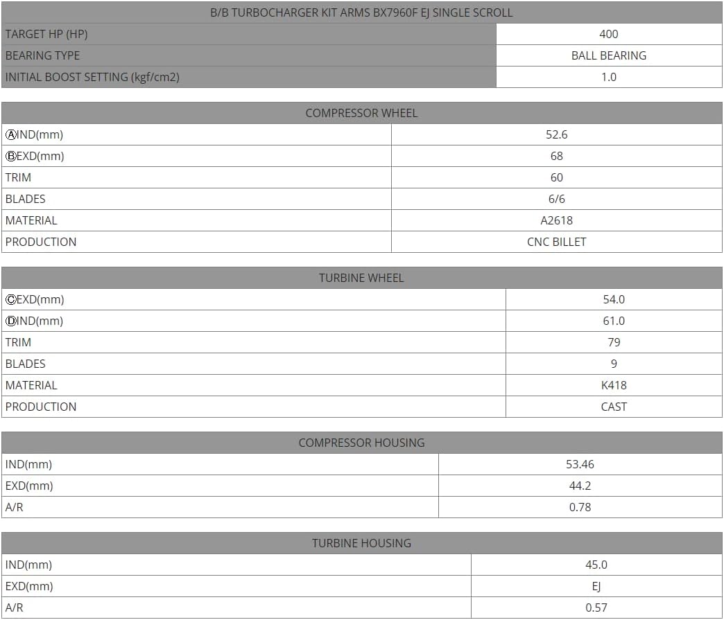 Upgrade your compatible EJ-series 2.0–2.5 L engine (Non-STI) with the ARMS BX7960F single-scroll turbocharger kit — engineered for improved airflow, quicker spool-up, and reliable boost delivery. The kit includes a CNC-machined billet compressor wheel for superior induction efficiency compared to stock or cast wheels, resulting in better throttle response and enhanced engine performance. With a ball-bearing center section, this turbocharger delivers smooth and consistent boost across the RPM range, making it suitable for both street-driven and performance-focused builds. Supplied as a complete bolt-on package, this turbo kit includes the necessary compressor and turbine housings, oil supply/return lines, gaskets, studs, and all standard installation hardware — offering a straightforward upgrade path for compatible EJ engines seeking a forced-induction performance boost.
