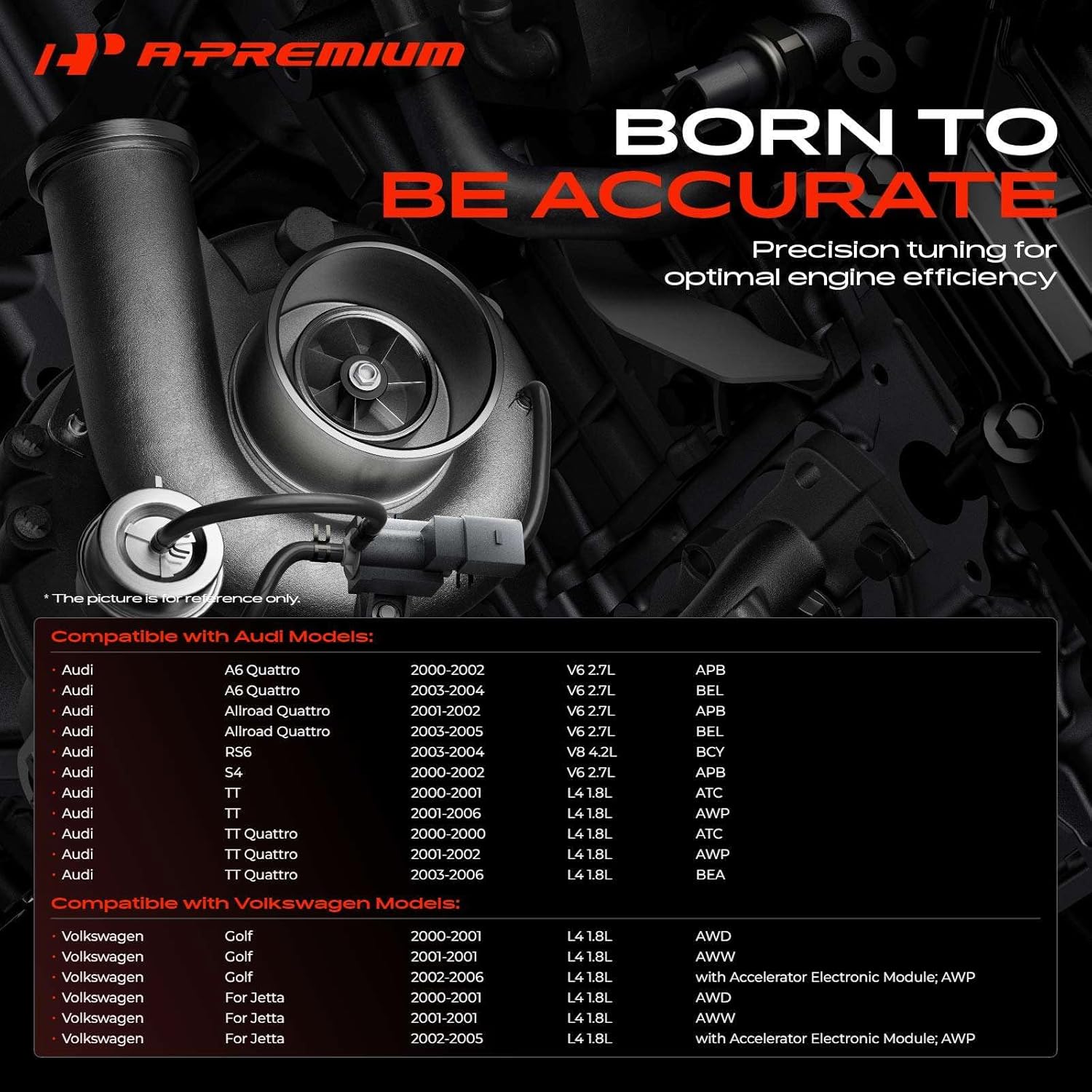 A-premium Turbocharger Boost Solenoids are an ideal choice to replace your broken Turbocharger Boost Solenoids. All Turbocharger Boost Solenoids meet or exceed OEM specifications. Due to high manufacturing standard, it will come with one year quality guarantee. Compatible with Audi Models: 2000-2002 A6 Quattro APB 2003-2004 A6 Quattro BEL 2001-2002 Allroad Quattro APB 2003-2005 Allroad Quattro BEL 2003-2004 RS6 BCY 2000-2002 S4 APB 2000-2001 TT ATC 2001-2006 TT AWP 2000-2000 TT Quattro ATC 2001-2002 TT Quattro AWP 2003-2006 TT Quattro BEA Compatible with Volkswagen Models: 2000-2001 Golf AWD 2001-2001 Golf AWW 2002-2006 Golf with Accelerator Electronic Module; AWP Compatible with 2000-2001 Jetta with Accelerator Electronic Module; AWD Compatible with 2001-2001 Jetta with Accelerator Electronic Module; AWW Compatible with 2002-2005 Jetta with Accelerator Electronic Module; AWP Specifications: Adjustable: No Color: Black Connector Gender: Male Hose 1 Inside Diameter: 0.375 Inch Hose 3 Inside Diameter: 0.375 Inch Hose Connector Quantity: 3 Housing Material: Plastic Mounting Bracket Included: Yes Terminal Gender: Female Terminal Quantity: 2 Terminal Type: Blade OEM Number: 078906283A, 667-106, 667106 Quantity Sold: One Piece Note: It only fits Turbocharged, not Naturally Aspirated; 2002-2006 Golf and 2002-2005 Jetta only fit the model with Accelerator Electronic Module, AWP