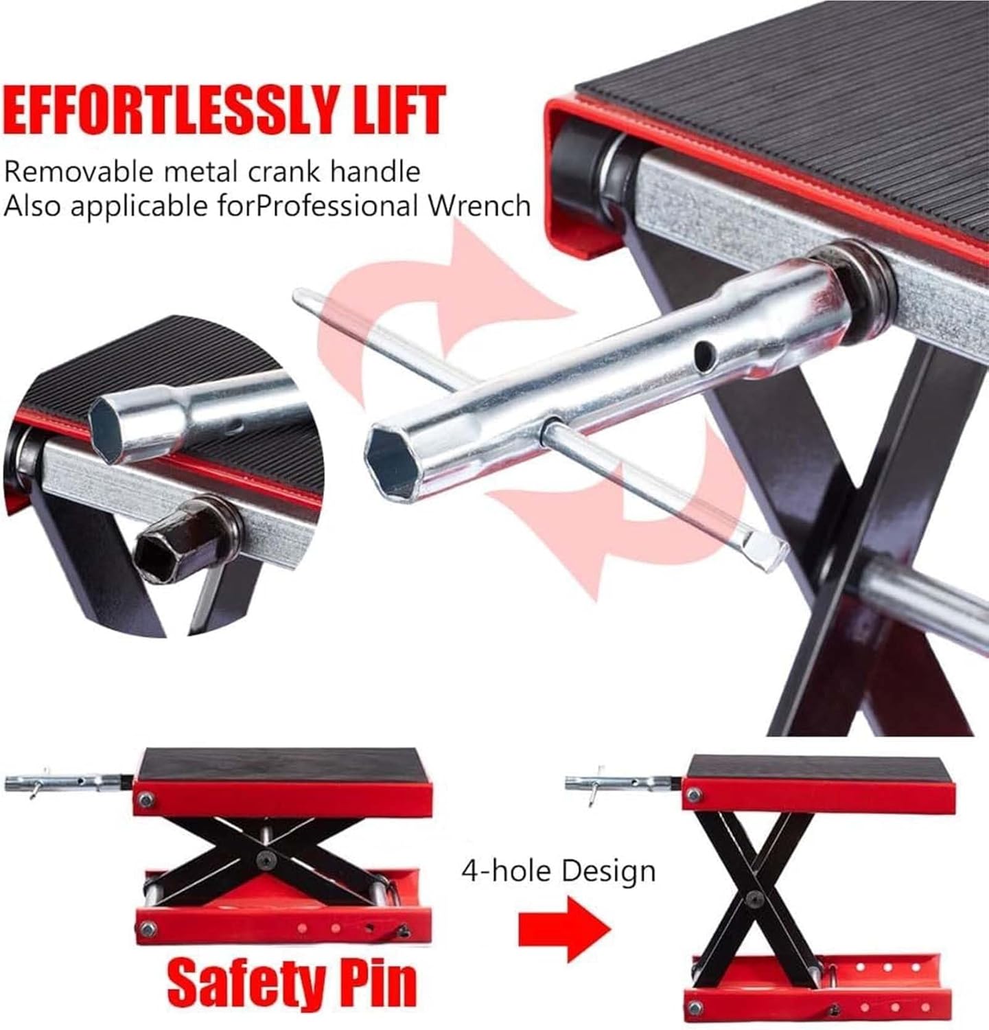 The Motorcycle Jack Lift is designed for durability and performance, constructed from high-quality steel to ensure longevity and reliability. With a substantial load-bearing capacity of 500kg, it is capable of lifting a wide range of motorcycles, including standard, cruiser, touring, and sports bikes. The lift features a minimum height of 8.5cm and extends to a maximum height of 34cm, providing versatility for various lifting needs. Its platform size measures 36*22cm, offering a stable and secure base for your motorcycle. Weighing 13kg, it is both sturdy and manageable. Each purchase includes Motorcycle Jack Lift. Please note: The actual color of the item may vary slightly from the images due to display and photographic lighting conditions. Additionally, there may be minor size discrepancies due to manual measurement; we recommend referring to the actual product received for precise dimensions. The scissor lift's wide, flat platform ensures stable bike positioning and safe working conditions, making it an essential tool for motorcycle maintenance and repair.