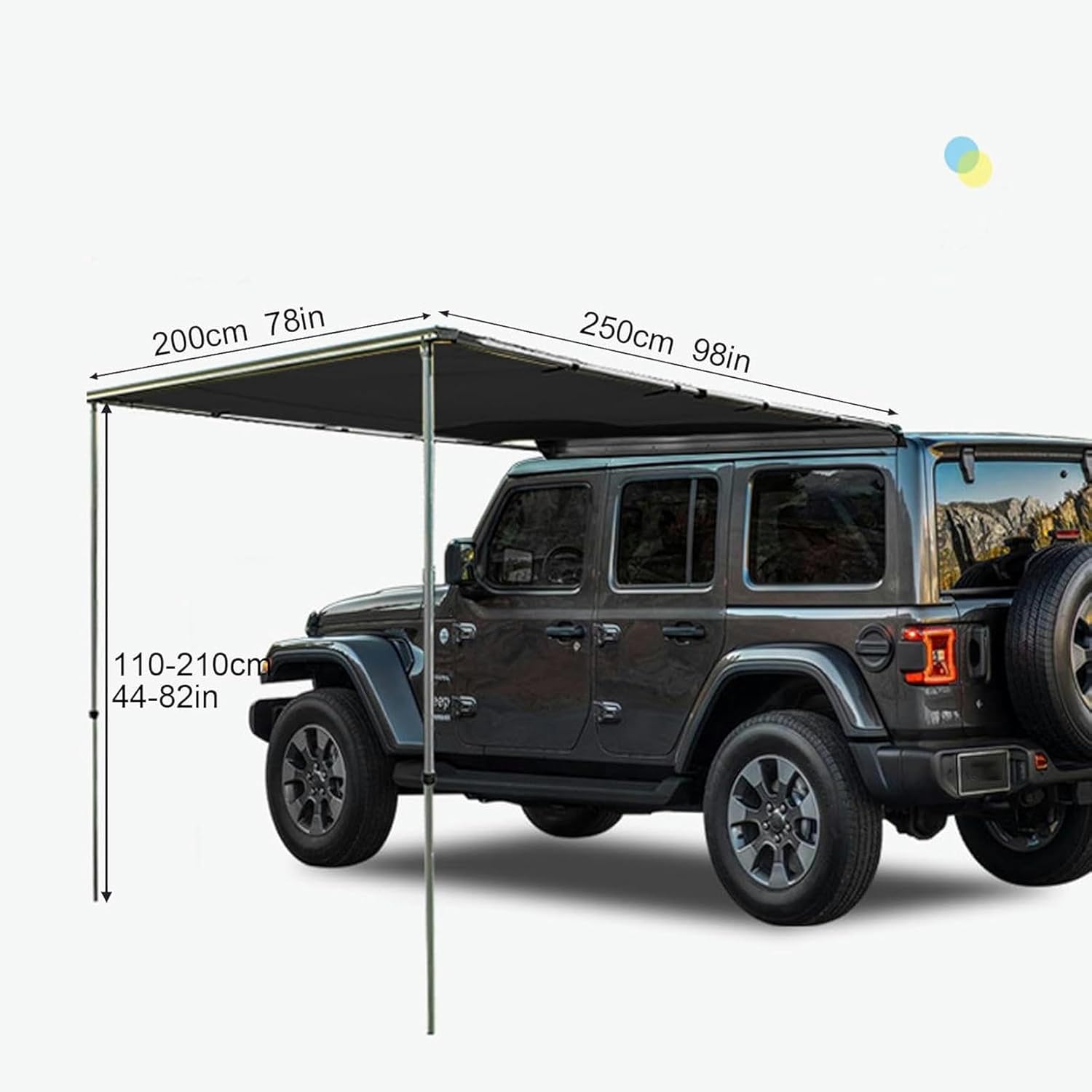 LED light designThere is a bar of lights in the middle of the lateral awning of the car to provide brilliant lighting at night.The light bar located on the transverse bars can be easily moved forward and backward or even disassembling if it is not necessary.Installation requirementThis awning needs a baca for installation.It cannot be mounted on vehicles without one.Confirm that your car is equipped with a baca before making the purchase.SpecificationsSize: 160 x 250 cm (63 x 98 inches), 200 x 250 cm (79 x 98 inches), 200 x 300 cm (79 x 118 inches), 250 x 250 cm (98 x 98 inches), 250 x 300 cm(98 x 118 inches)Post material: aluminum alloyFabrics: 210d oxford fabricAdjustable height: 3.9 feet (120 cm) - 6.8 feet (210 cm)Storage box color: Black case, silver case.Package content1 car awning.1 x accessories for tent1 x instructionWarningTo prolong the useful life of the awning, check it out during strong winds or adverse climatic conditions and do not leave it outdoors all night.The dimensions are measured manually, there is an error of 0.1-0.3 ”, please understandIf you have any questions, contact us by email in time, we will answer within 12 hours!