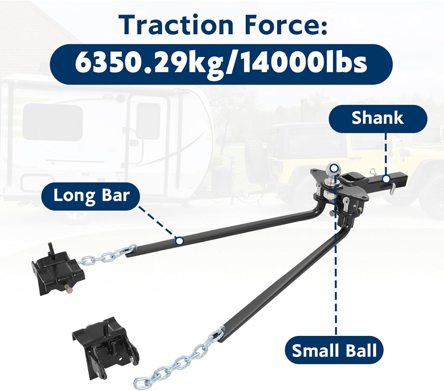 14000 lbs Steel Trailer Hitch Anti Sway Control Hitch Towing Weight Distributing Hitches Kit with Connection Bar and CrowbarSpecificationsColor: BlackStyle: ModernMaterial: #45 SteelProcess: Spray MoldingAssembly Required: YesTraction Force: 6350.29kg/14000lbsApplicable Trailer Frames: Max 17.78cm/7inProduct Size: 83x29x19cm/32.68x11.42x7.48inPackage Size: 90x20x20cm/35.43x7.87x7.87inGross Weight: 41kg/90.39lbsNet Weight: 38.95kg/85.87lbsIncluded1 x Weight Distribution Hitch1 x Crowbar1 x English ManualOther Accessories for AssemblyNotes1. Please check the size carefully before ordering.2. Please do not pull a trailer that exceeds the maximum towing capacity (14,000 lbs).3. Please read the instructions carefully and take note of the safety precautions contained therein.4. Please allow the slight color difference caused by the shooting light and 1-3cm error due to manual measurement, and make sure you do not mind before you order.