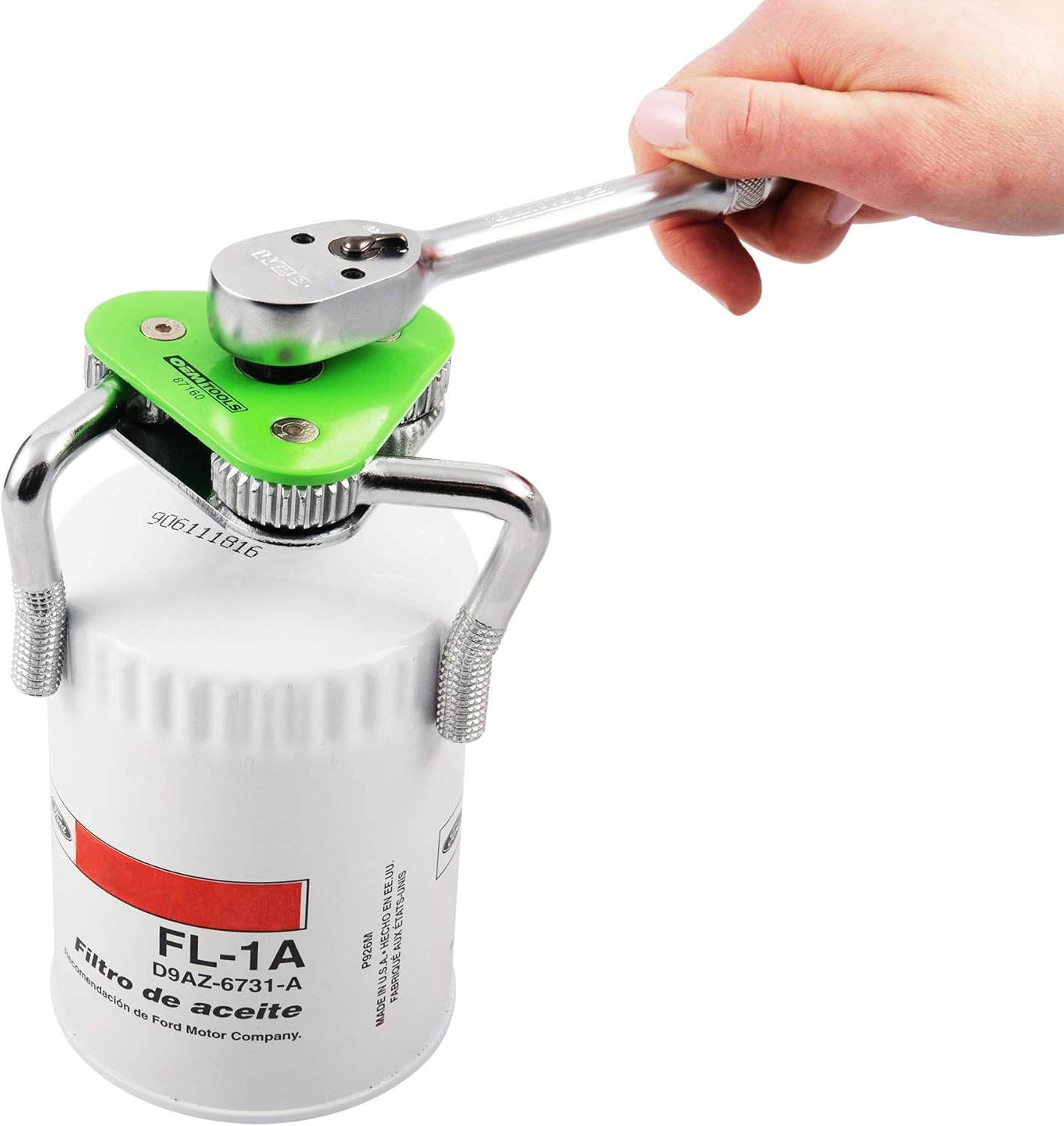 The OEM 25320 Oil Filter Pliers/Wrench with Slip Joint Handle, 2-1/2-Inch to 4-5/8-Inch. The heavy-duty forged steel jaws make quick and easy work of even the toughest oil filters. Pliers are bent 20-Degree to get into tight places and have built-in teeth for non-slip service. The handles are dipped in vinyl for maximum comfort and safety. Slip joint handles. 2-1/2-Inch to 4-5/8-Inch (63.5mm to 116mm) capacity. Designed for professional auto mechanics and heavy duty applications. The OEMTOOLS Adjustable 3 Jaw Oil Filter Wrench is engineered for mechanics and DIY oil changers who need dependable performance in tight spaces. Its universal claw design automatically adjusts to fit spin-on filters from 2-1/2" to 3-7/8". Spring-loaded legs ensure a secure grip that resists slippage, while the compact profile makes filter changes easier in crowded compartments. Compatible with 3/8-inch drive tools, this wrench is a must-have addition to any oil change kit or garage toolbox.
