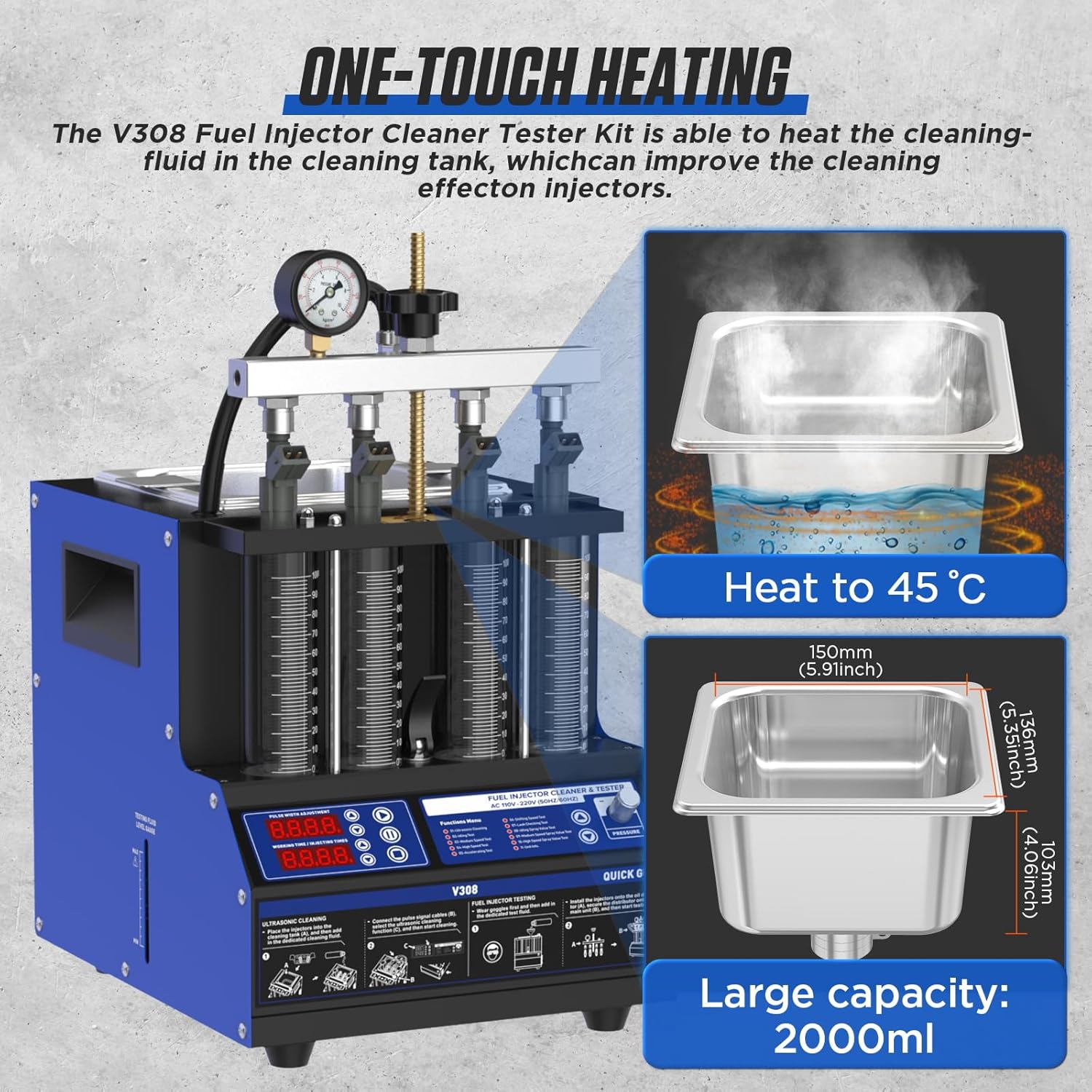 1. BELEY Smart Fuel Injector Tester & Cleaner Your On-Vehicle Diagnostic & Flushing Expert. 🔧 Powerful & Versatile Operation: Powered by your vehicle's 12V battery, this all-in-one tool performs diagnostic tests and can connect to cleaning fluids for on-the-spot flushing and maintenance. 🤖 Auto-Recognition & Wide Compatibility: Automatically identifies injector type with a button click. Works with a vast range including PFI, FSI, GDI, TFSI, Piezo, and many diesel injectors. 🎛️ Adjustable Pulse Frequencies: Features 5 adjustable pulse frequencies (1Hz-20Hz) for precise diagnostics. Send targeted pulses to pinpoint issues, check for leaks, and verify spray patterns. 🔌 Universal Adapters for Full Coverage: Includes 6 universal adapters to fit most direct injection and other injectors, allowing you to test spraying ability comprehensively. 📦 Complete Kit with Premium Support: Comes with driver box, DC adapter, power cord, signal cord, 6 adapters, and extension cord. Backed by a 2-year warranty and 24/7 customer support. 2. V308 Professional Heated Ultrasonic Cleaning Machine Your Off-Vehicle Deep Cleaning & Performance Validation Lab. 🔥 Heated Ultrasonic Cleaning: Built-in heater warms cleaning fluid to 40°C (104°F), significantly boosting chemical activity to dissolve and remove stubborn carbon deposits more effectively than cold cleaning. 🖥️ 9 Comprehensive Injector Test Modes: Built-in microcomputer simulates 9 real engine conditions (Idle, Acceleration, High Speed, Leak Test, etc.) for accurate performance testing before and after cleaning. ⚡ Smart Digital Control & Display: Microcomputer-controlled fuel pressure regulation with real-time digital display. Ensures stable, adjustable pressure compatible with all EFI vehicles for fully automated operation. 💧 High-Capacity Batch Cleaning: Large 2000mL transparent tank allows you to clean multiple injectors at once, dramatically improving efficiency. Features one-to