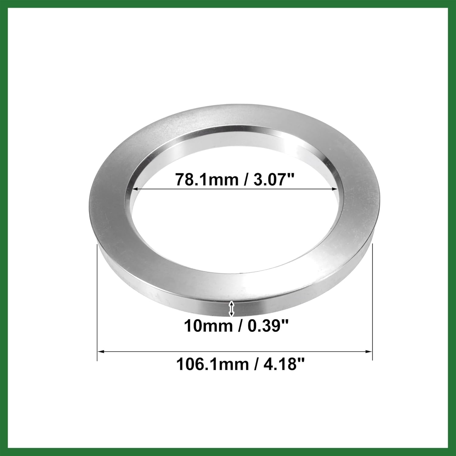 Description:This device is installed between the vehicle's hub and the wheel.The hub ring fills in the gap between the vehicle hub and the center bore of the wheel.Ensures a nice fit between your wheel and the hub.Designed to eliminate unwanted steering wheel vibrations.Precision machined to stop vibrations and ensure a snug fit every time.How to choose the hub ring?Hub rings are sized by using two different numbers that are measured in millimeters.Notes:The outside diameter of the spigot ring should fit the wheel's center bore in the back of the wheel.The inside diameter is the size of the wheel hub on the vehicle you intend to fit the wheels too.Specification:Material: Aluminum AlloyColor: Silver ToneInner Diameter: (Vehicle Hub Size) 78.1mm / 3.07"Outer Diameter: (Wheel Bore Size) 106.1mm / 4.18"Thickness: 10mm / 0.39"Package Includes:4 x Hub Centric Rings