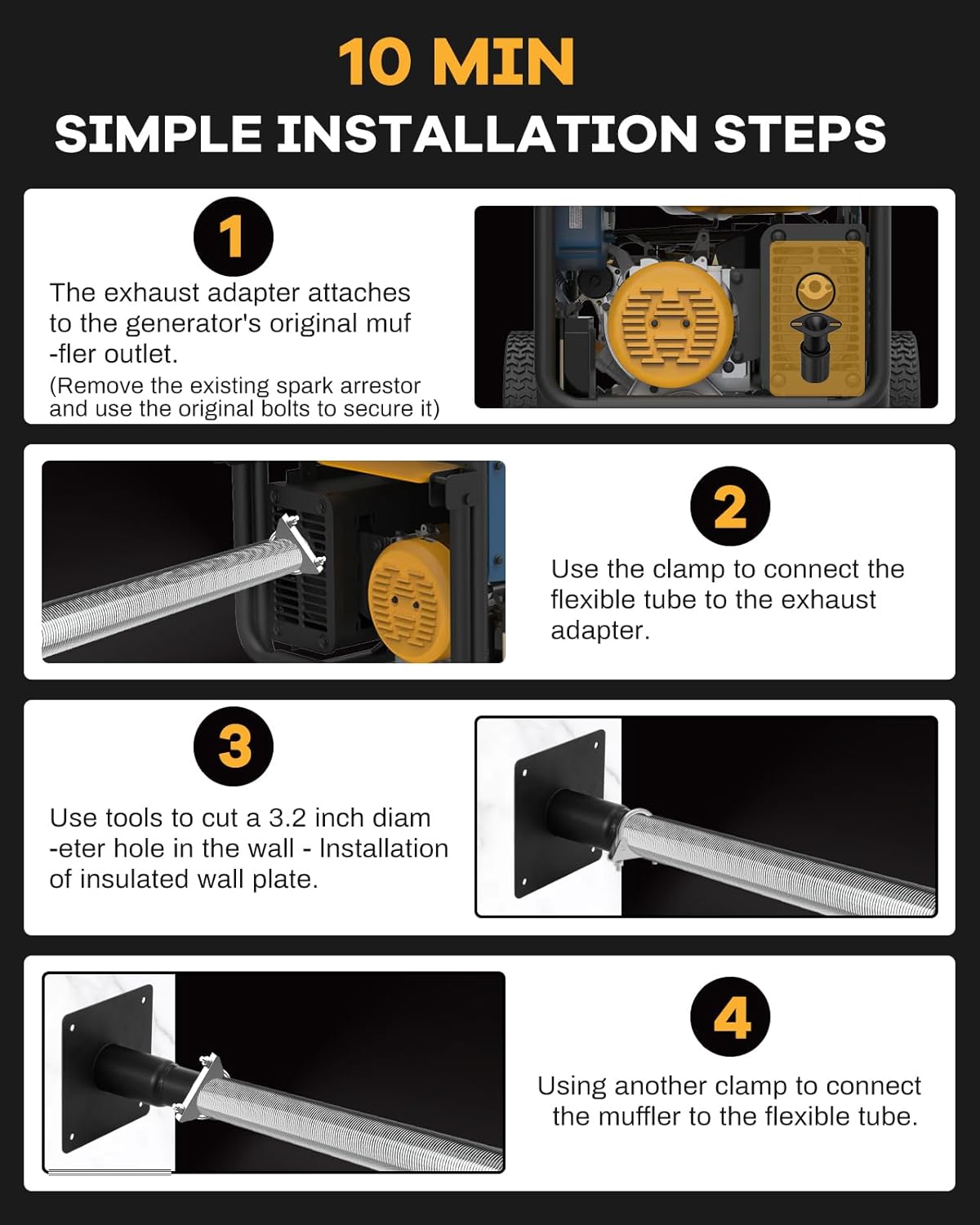 | Included Components | 1 universal muffler adapter, 2 clamps, 1 flexible hose, 1 muffler silencer, 1 wall mounting plate |