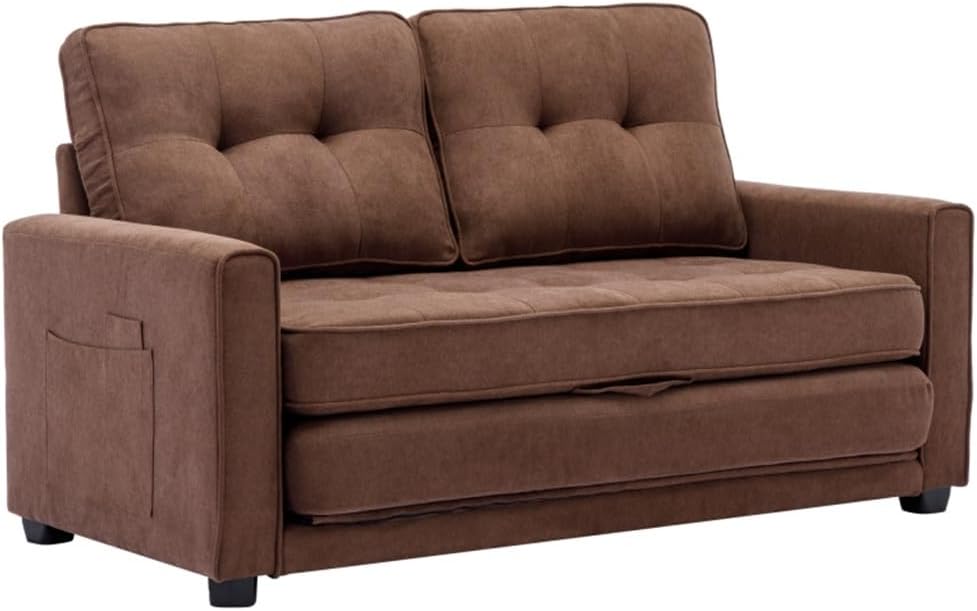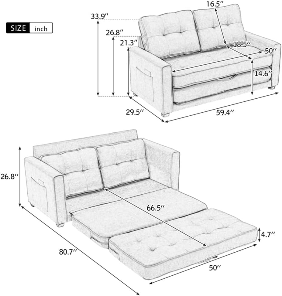 This couch has straps to assist pull out can quickly turn the sofa into a bed, provide extra sleeping space when needed. for smaller living areasTailored high back both stylize this sofa and deliver back support, which makes it for bedtime reading, movie watching or daytime power naps. Add a functional, yet elegant and stylish piece to your living room, guest bedroom, or kids' room with this glamorous sofa bed.Our sofa comes with two large side-storage pockets to keep everything within reach. Use it to store your television remote, mobile phone, glasses or that book you want to finish.This masterfully crafted sofa tantalizes, with pillow plushness and a chenille fabric that’s a breath of fresh air. The seat is filled with thickened foam to ensure good resilience while not sinking easily.Encased solid wood frame is constructed for stability and heavy use. Solid rubber feet to ensure sufficient load-bearing capacity. Upholstery Material:ChenilleFrame Material:PlywoodSeat Construction:Pocket Spring+FoamSize: as shownSet Includes1*sofa(no other presentation items included).Notice:1. Due to manual measurement, please allow 2-3% error, before you bid, please make sure you don't mind.2. The color may vary due to different displays, please refer to the actual product.