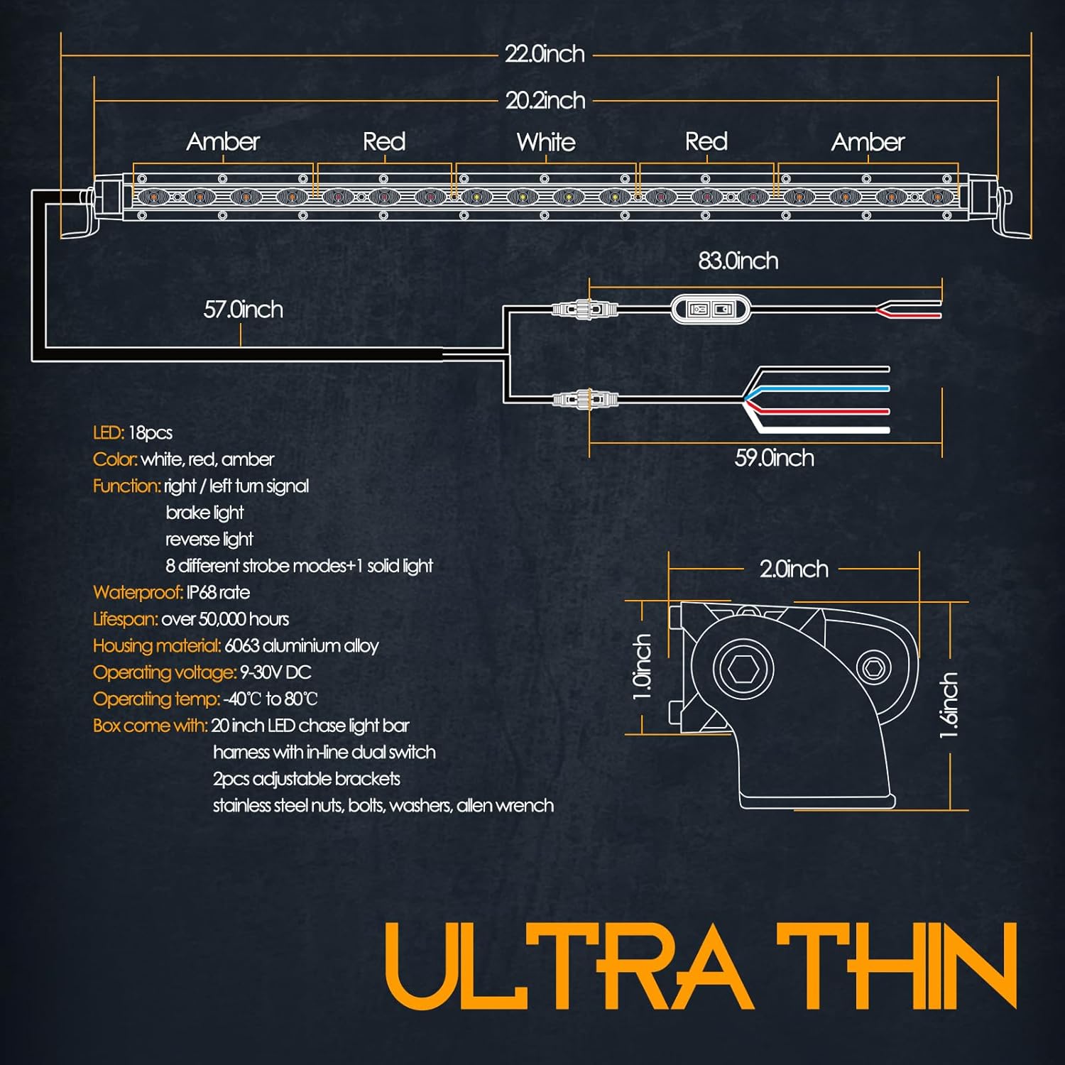 | Included Components | 20 inch LED chase light bar, adjustable brackets, stainless steel nuts, bolts, washers, wrench, wire harness with in-line dual switch |