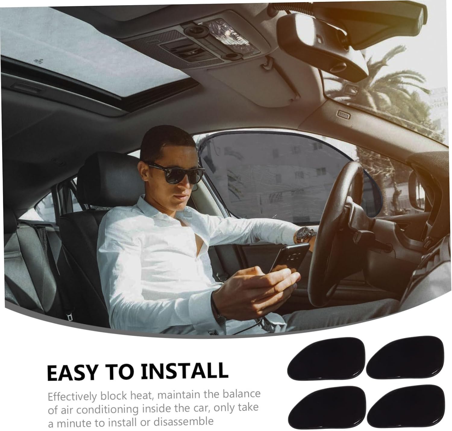Package List 4 x Auto Sun Shield Features -Material: PVC Auto Sun Shield. -Size: 38x63x0.5cm/15x24.8x0.2inch Car Window Curtain. -Color: Black. - block heat, maintain the balance of air conditioning inside the Interior Sunshade. - Made from material, durable to use UV Protection Curtain Car. - Only to install or disassemble. - Suitable for vehicles of all models. - Blocking the strong UV of the summer sunlight.Goods DescriptionCar Interior Sunshade It holds up a shade for your car in the strong sunlight.UV Protection Curtain Car This item is a set of foldable visor made of high grade material.Auto Sun Shield Static suction, easy to install and remove, fits car window.Car Window Curtain It provides anti-UV protection and will slow down the interior aging caused by direct sunlight