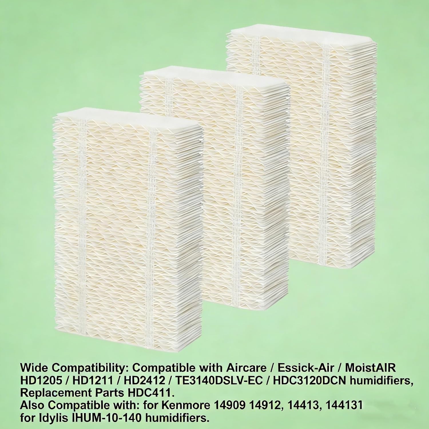 Suitable for: Compatible with Aircare / Essick-Air / MoistAIR HDC3120DCN, TE3140DSLV-EC, HD1205, HD1211, HD2412 humidifier. Compatible with 14909 14912, 14413, 144130, 14416, for Idylis IHUM-10-140 humidifiers. Replacement Parts HDC411. Value Package : 3 Pack* HDC411 Filter Easy to Use: Simply Remove the New Filter, Replace the Old Accessory is OK.