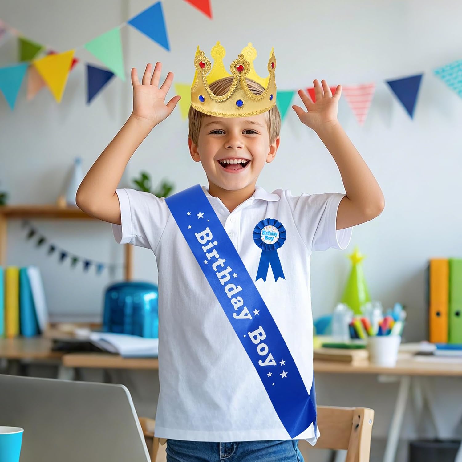 Celebrate your boy's birthday in style with our Birthday Crown, Sash, and Button Pin Accessory Set, designed to add a touch of royalty to his special day. This comprehensive set includes a regal crown that will make your little one feel like a prince, a sash that can be personalized to suit the birthday boy's unique personality, and a distinctive button pin that completes the look. Perfect for theme parties or as photo props, these accessories are easy to use and will elevate any birthday celebration. Make your child's birthday unforgettable with this charming accessory set. Add it to your cart and get ready to throw a party fit for a king! Note: 1. The size may exist little difference due to hand manual measurement. 2. Due to brightness of your monitor and light brightness, the real color of the item may slightly different from the pictures shown on.