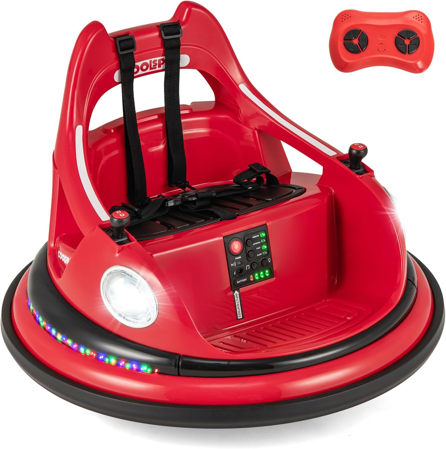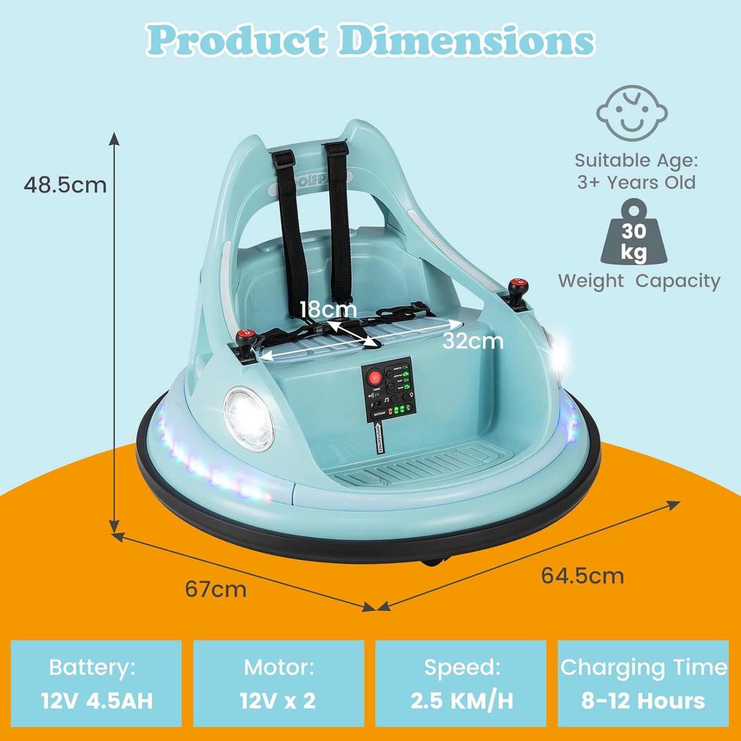 Description: Create a happy childhood for your kids with this thrilling ride-on bumper car! This kids bumper car is powered by a 12V battery and 2 motors that ensure hours of fun. Kids can zoom around at 2 speed settings, from a gentle 1.55 MPH to a thrilling 3.1 MPH. The dual joystick control allows for precision movements, including an exhilarating 360° spin. Meanwhile, the included remote control with emergency brake allows parents to take charge whenever necessary. The bumper car features built-in music and wireless connectivity, allowing your kids to groove to their favorite tunes. The ride is visually stunning too, thanks to the vibrant side LED light strip with 5 modes paired with bright headlights. Moreover, the 5-point safety belt, soft bumper and slow start & stop function ensure a safe ride, bump, race, spin every time. Features: 2 ways to drive: manual joystick operation or remote control Ride with fun thanks to the built-in music and wireless connection Forward/backward, 360° spin and 2 adjustable speeds 5 LED lighting effects offer a fantastic riding experience 5-point seat belt and soft bumper strip for safe rides High backrest offers better support and comfort 2 bright headlights catch eyes in low light conditions 12V4.5AH rechargeable battery offers long hours of fun
